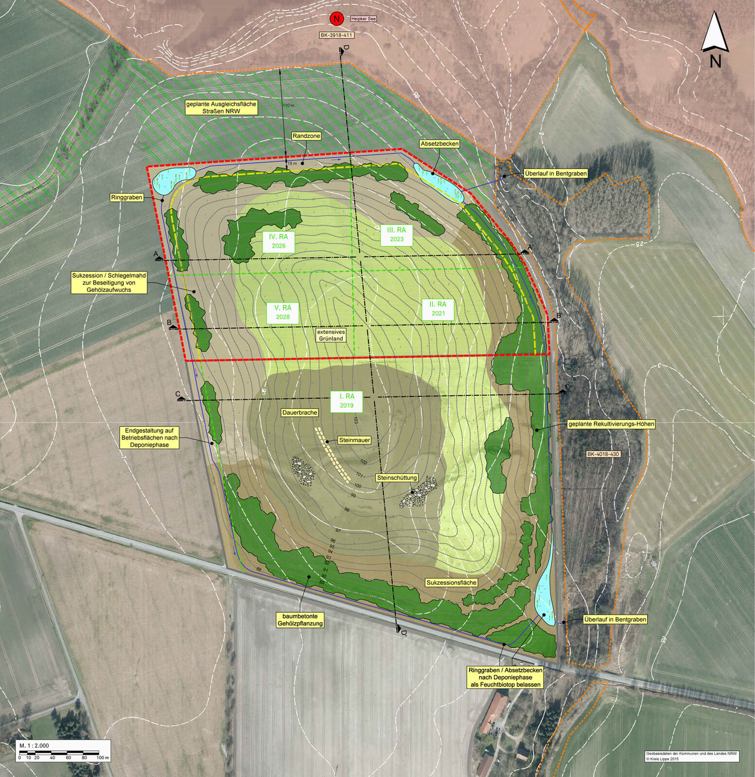 Die Erweiterungsfläche gliedert sich in insgesamt 5 Deponieabschnitte, die schrittweise verfüllt und rekultiviert werden. Bei einem jährlichen Schüttvolumen von 50.000 m³ wird die Dauer des gesamten Deponiebetriebs auf 14 Jahre geschätzt. Der Schuttkörper der Deponiefläche wird mit „weichen“ Geländeneigungen von 1:10 bis 1:20 hergestellt. Auf diese Weise kann sich die verfüllte Deponiefläche in das umgebende Landschaftsrelief eingliedern. Als langfristiges Rekultivierungsziel ist die Nutzung der verfüllten Deponie als Extensivgrünland bzw. Dauerbrache vorgesehen. Neben den Offenlandstrukturen sind Pflanzungen aus niedrigwüchsigen Dornensträuchern (Hundsrose, Weißdorn, Schlehe) geplant, um abgesehen von Lebensräumen für die Feldlerche ebenfalls Habitate für andere Arten (bspw. Neuntöter) zu schaffen. Im Bereich der Dauerbrache werden weiterhin Steinschüttungen vorgenommen und eine Steinmauer angelegt, die als Habitat für Reptilien fungieren können.