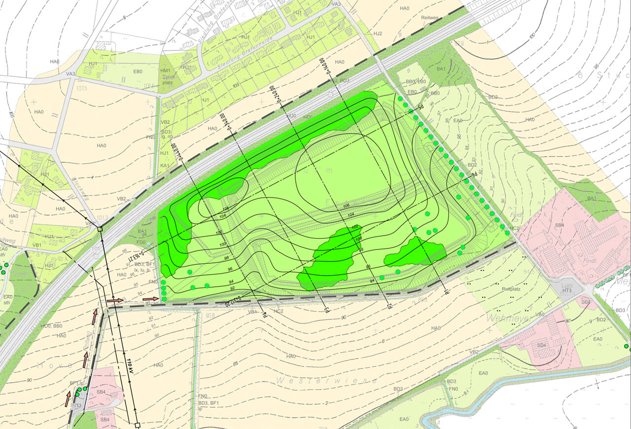 Zur Ablagerung des bei der Entschlammung des Obersees anfallenden Sediments haben wir zwei Polder geplant. Auf der 4 ha großen Fläche kann 130.000 m³ Schlamm aus dem Obersee eingebaut werden. Als Ablagerungsort haben wir eine benachbarte Fläche gewählt, um die Transportwege gering zu halten, eine Beförderung über eine Druckrohrleitung zu ermöglichen und eine Abfuhr per LKW zu vermeiden. Die Polder werden anschließend mit Boden angedeckt und begrünt. Dies erfolgt durch den zusätzlichen Einbau von unbelastetem Fremdboden. Der Endzustand ist eine landschaftstypische Kuppe mit Wiesen, Weiden und Einzelbäumen, die dem Charakter der Johannisbachaue entspricht.