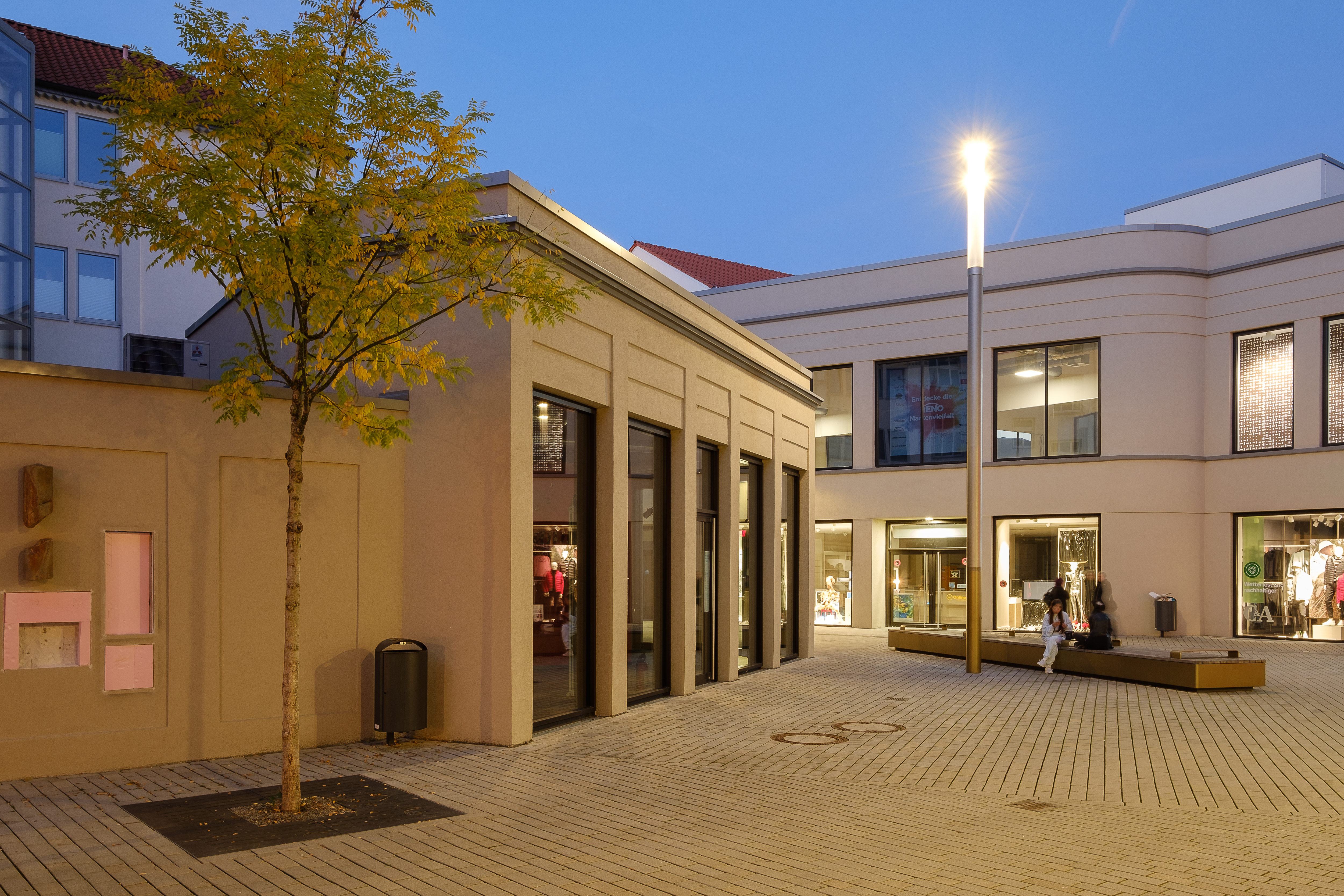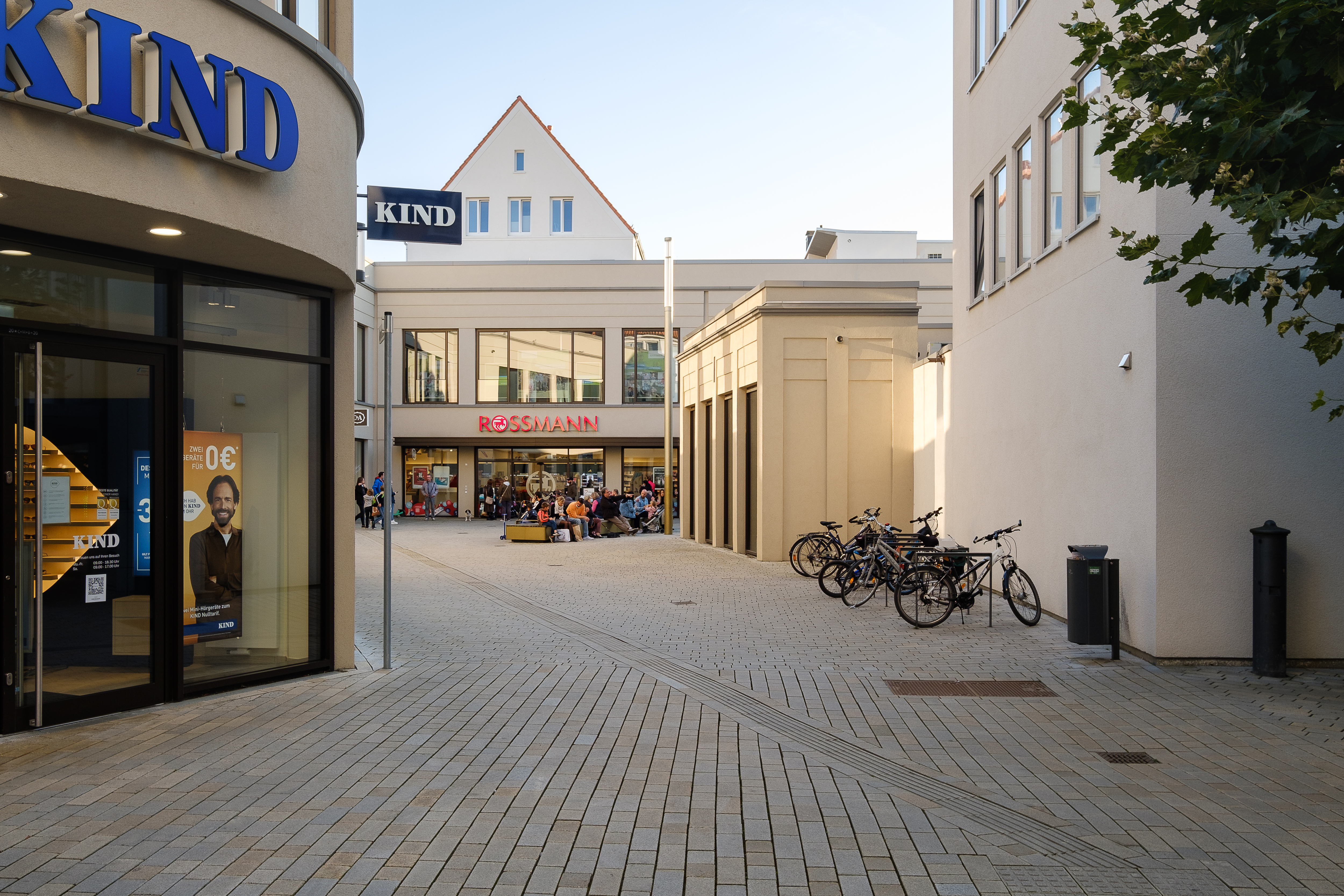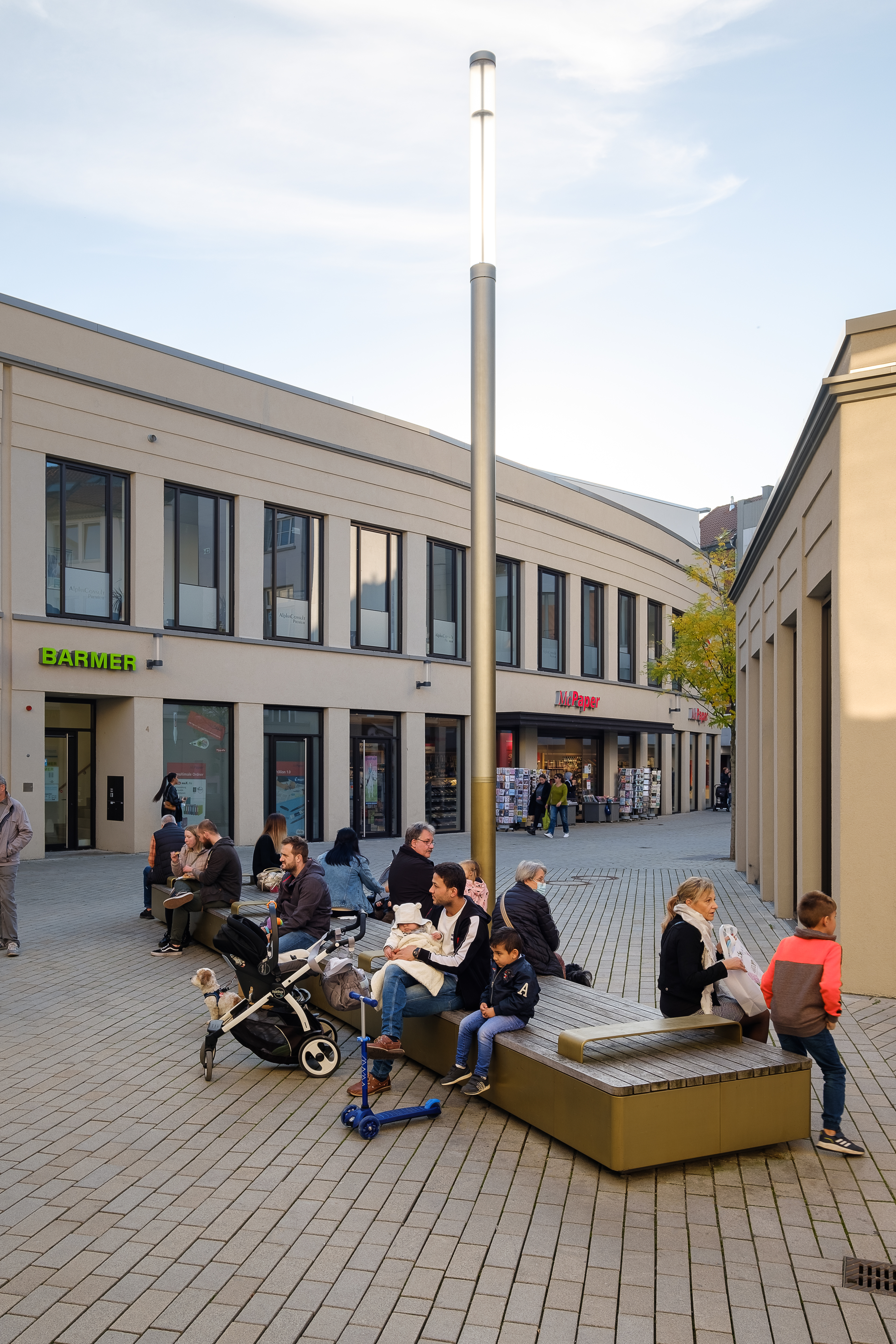Der Augustinerplatz gliedert sich an die Fußgängerzone an. Um diesen räumlichen Zusammenhang zu stärken, zieht sich der Gehbelag aus der Fußgängerzone auf den Platz. Dieser ist weitgehend nutzungsoffen gestaltet. Lediglich eine Kombination aus Lichtstele und Sitzbank – beides eigenentwickelte Sonderanfertigungen – markiert die Platzmitte und lädt zu Aufenthalt ein.