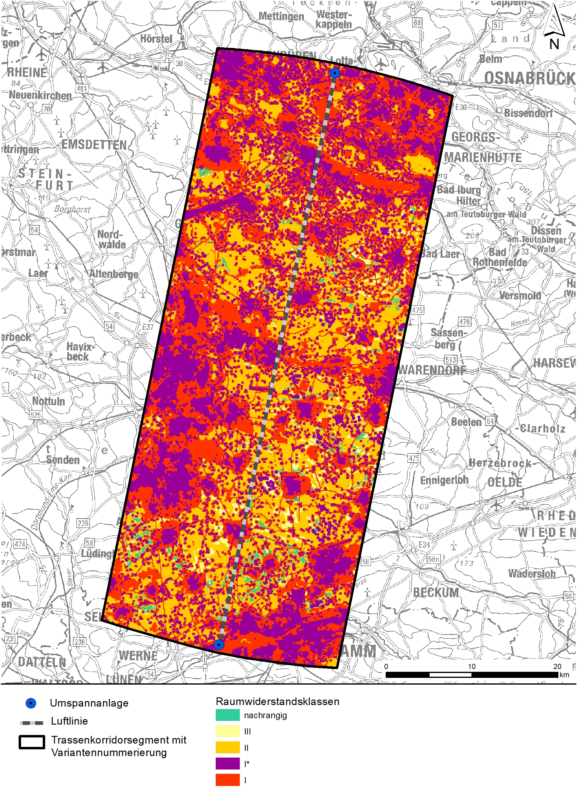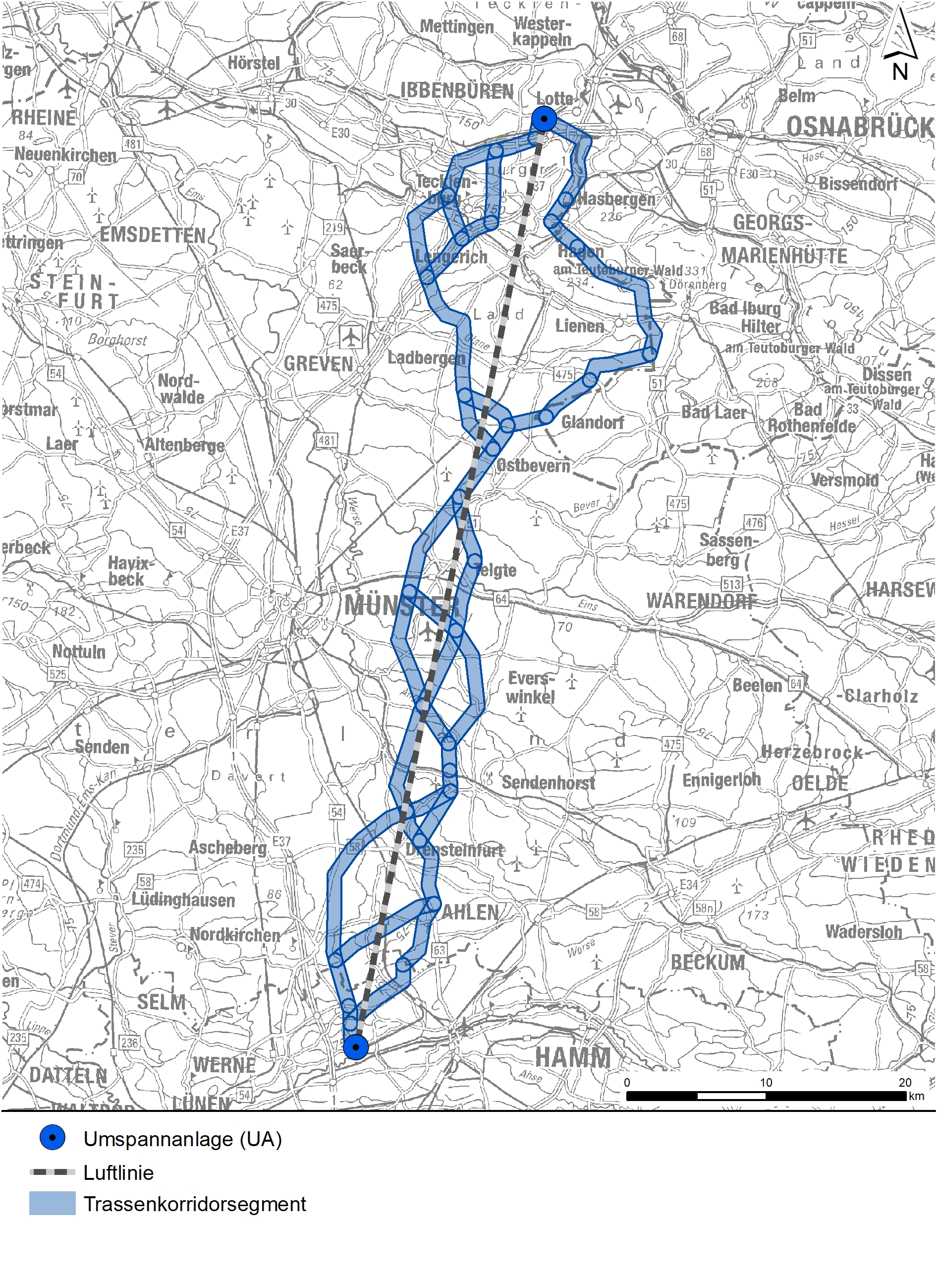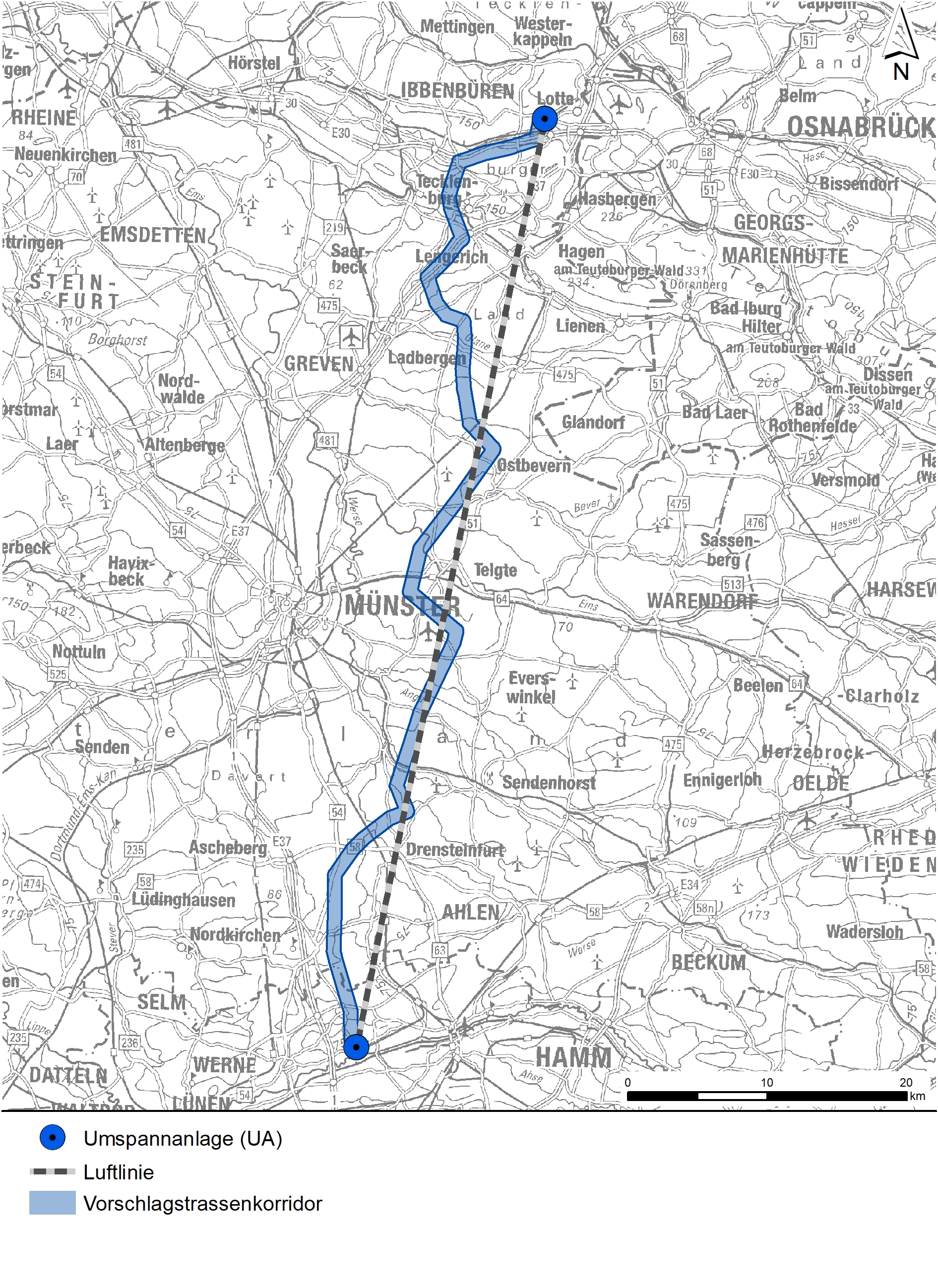 Zum 31.03.2025 hat die Bezirksregierung Münster im Rahmen einer gutachterlichen Stellungnahme nach Sichtung dieser Unterlagen den erarbeiteten Vorschlagstrassenkorridor bestätigt. Die Ergebnisse der Stellungnahme fließen in das anschließende und derzeit in Vorbereitung befindliche Planfeststellungsverfahren ein, für das unser Büro ebenfalls mit der Erstellung der umweltfachlichen Unterlagen beauftragt wurde.