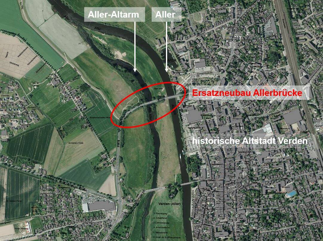 Die B 215 quert nördlich der Innenstadt von Verden die Aller und den Aller-Altarm auf einer Länge von etwa 400 m. Die Allerniederung als weitgehend naturnahe Flussniederung ist in diesem Bereich als FFH-Gebiet und als Vogelschutzgebiet gemeldet und als Naturschutzgebiet national unter Schutz gestellt. Dementsprechend sensibel ist im Rahmen der Planungen auf eine möglichst verträgliche Bauweise des Brückenneubaus sowie auf einen eingriffsminimierten Bauablauf insbesondere im Bereich der Gewässer zu achten. Zugleich ist die ästhetische Wirkung des Brückenneubaus vor der Kulisse der Verdener Altstadt zu würdigen.