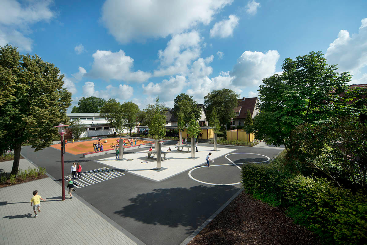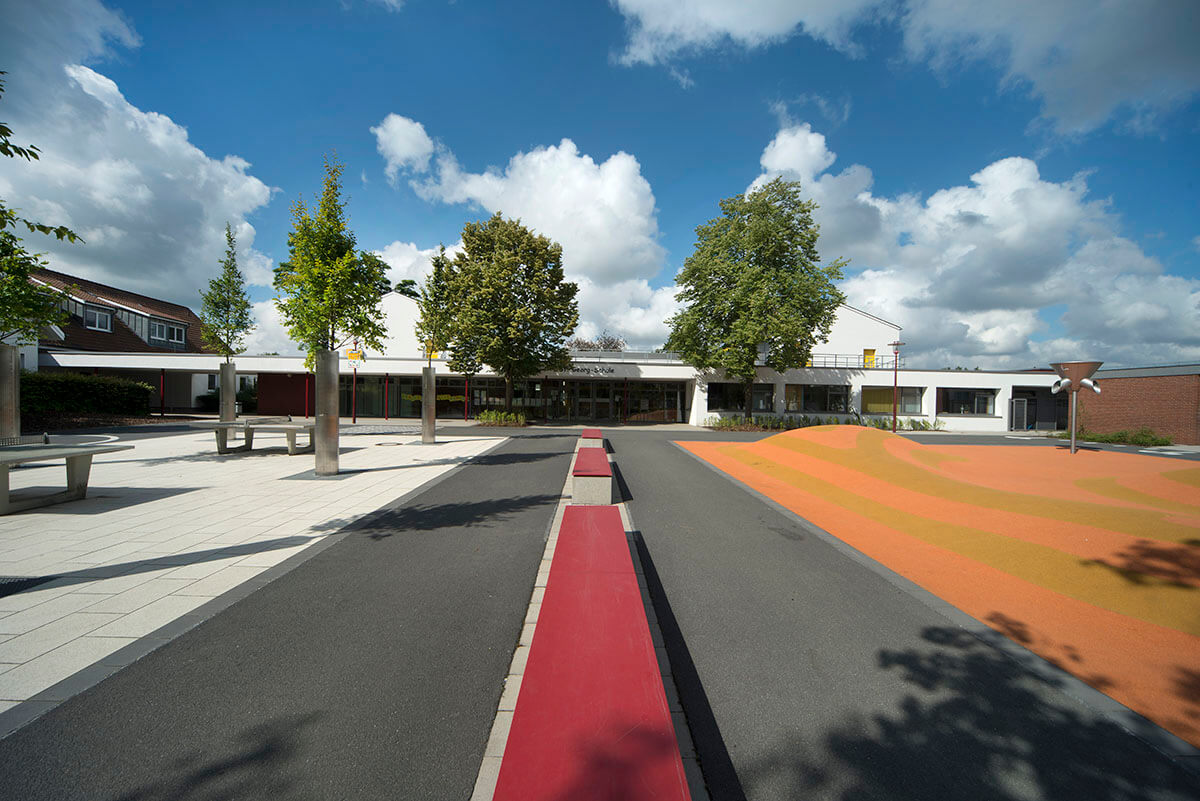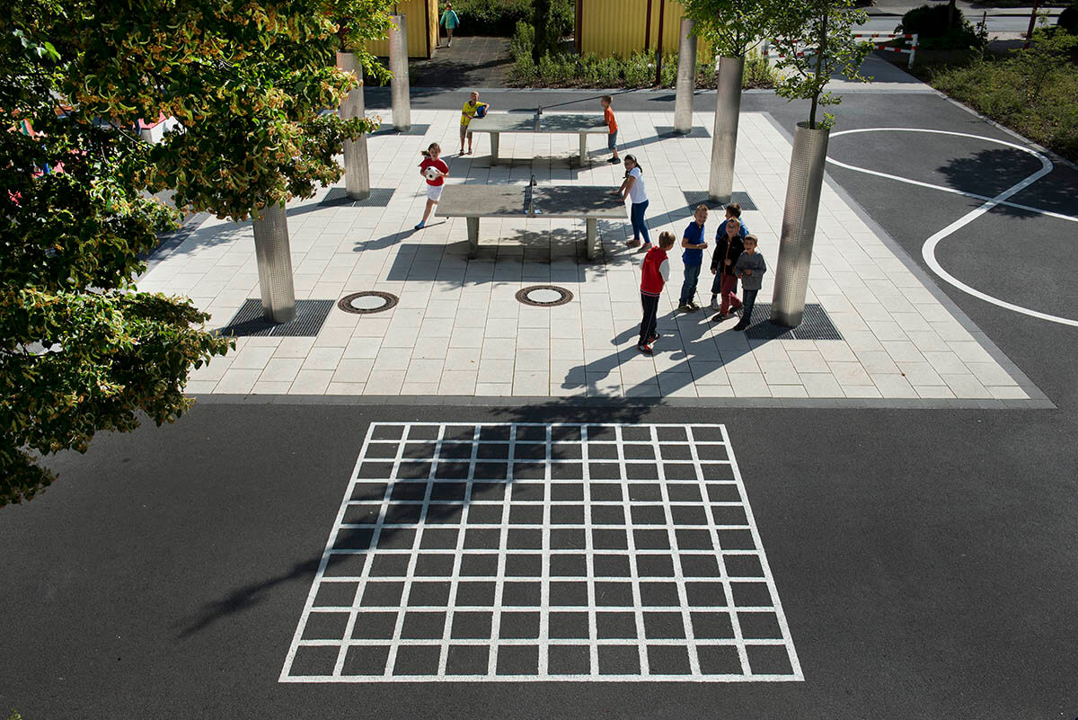 Vielfältig strukturierte Bereiche charakterisieren die neugestalteten Außenanlagen der Schule. Auf dem Schulhof laden eine markante Spielwelle aus Kunststoffbelag sowie Tischtennisplatten zu Bewegungsspielen und beschattete Bänke zum Aufenthalt ein. Ein Schulgarten mit einer kleinen Teichanlage, eine Freiklasse, ein Klettergarten sowie ein Sinnesparcours ergänzen das Angebot im Freiraum.