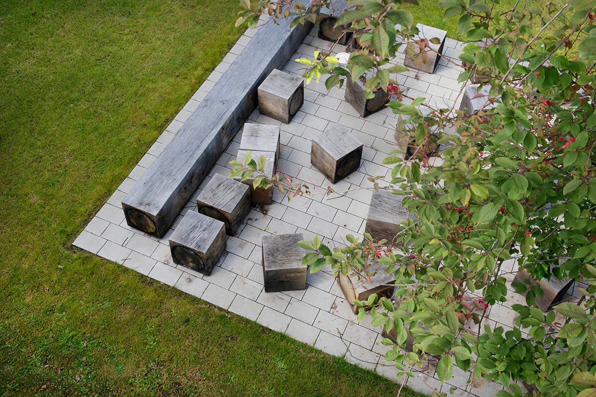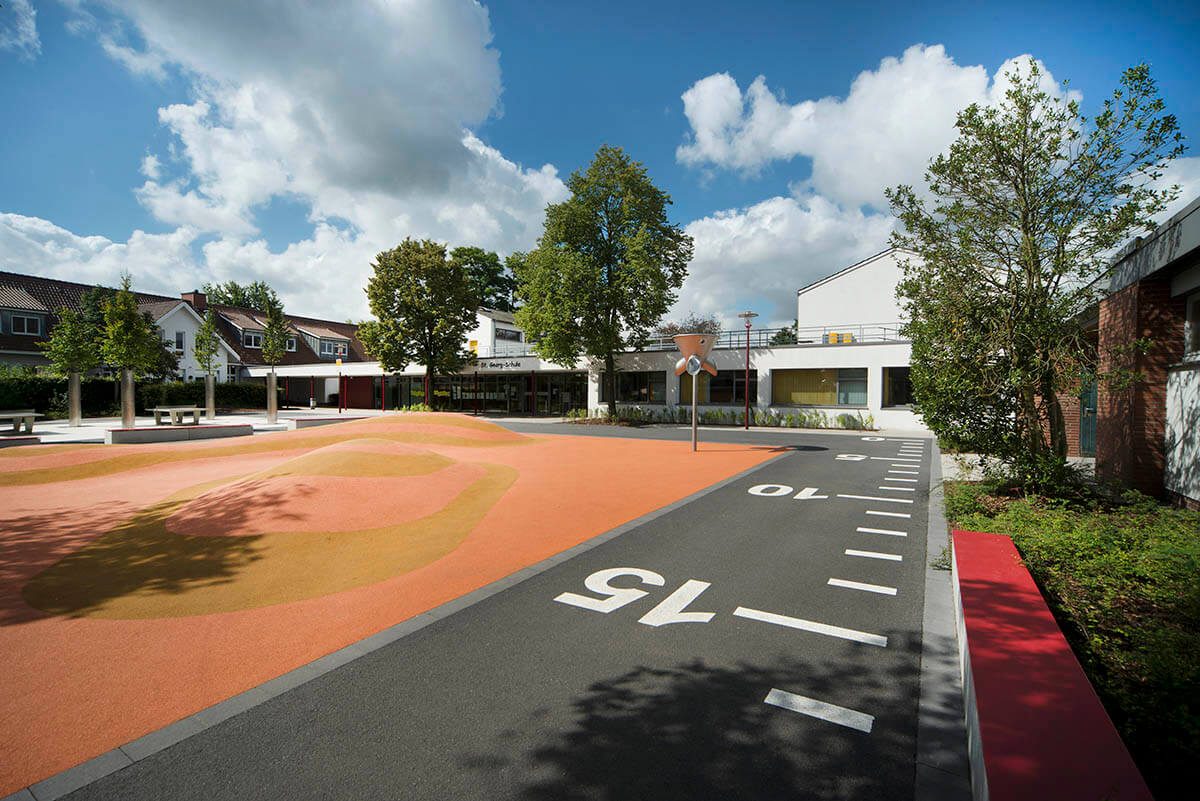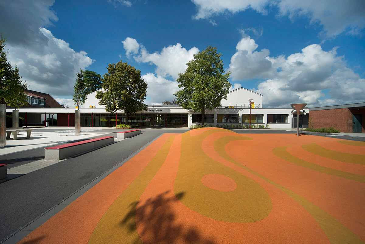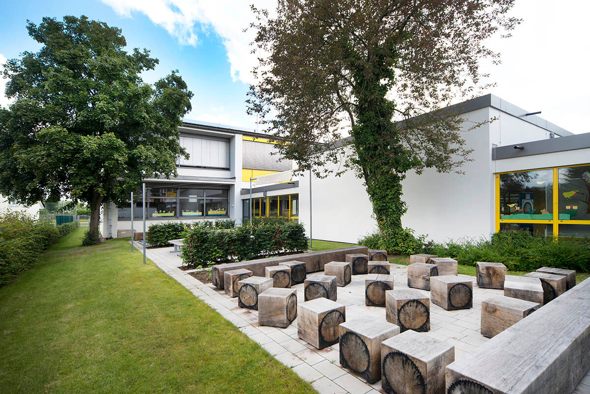 Vielfältig strukturierte Bereiche charakterisieren die neugestalteten Außenanlagen der Schule. Auf dem Schulhof laden eine markante Spielwelle aus Kunststoffbelag sowie Tischtennisplatten zu Bewegungsspielen und beschattete Bänke zum Aufenthalt ein. Ein Schulgarten mit einer kleinen Teichanlage, eine Freiklasse, ein Klettergarten sowie ein Sinnesparcours ergänzen das Angebot im Freiraum.