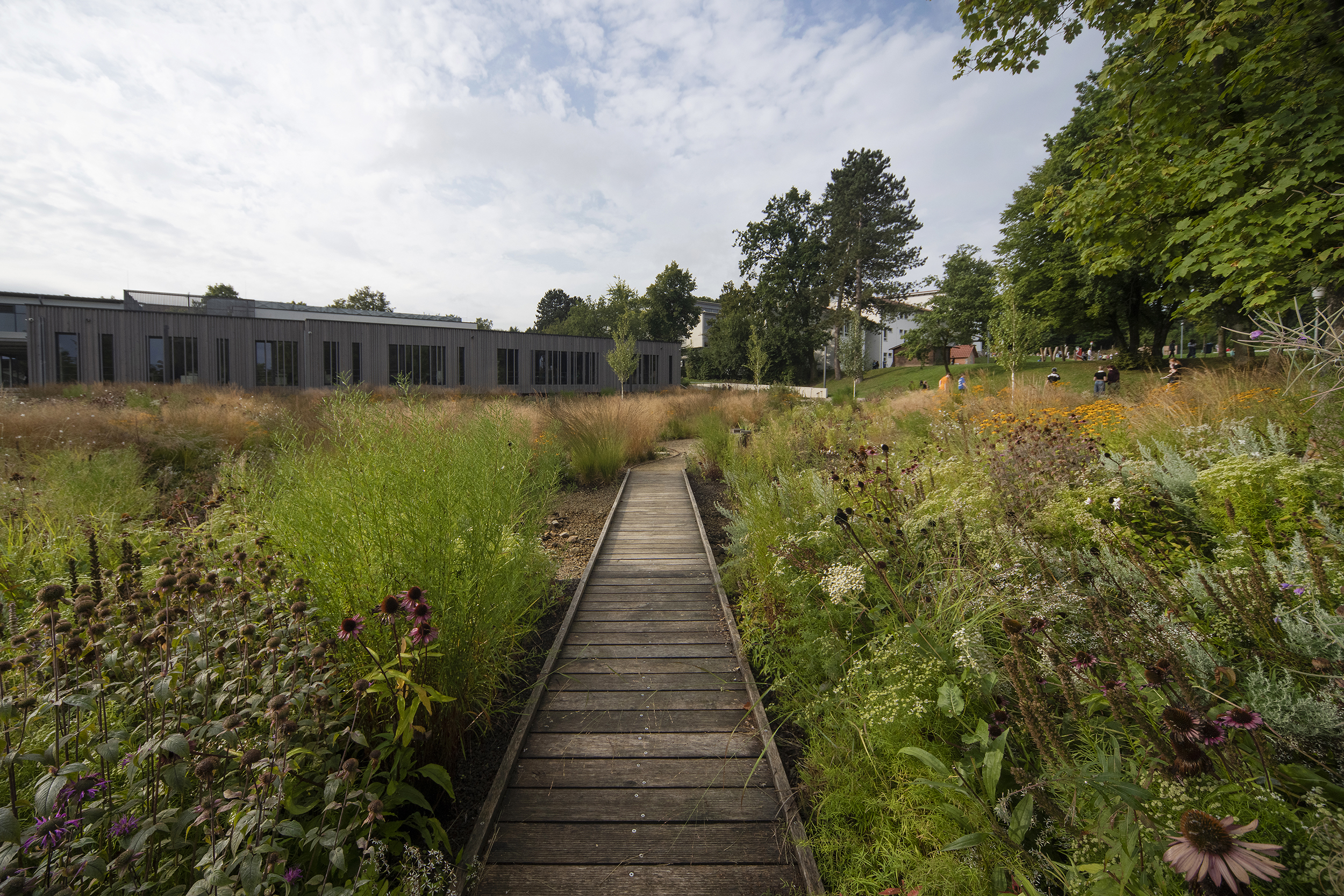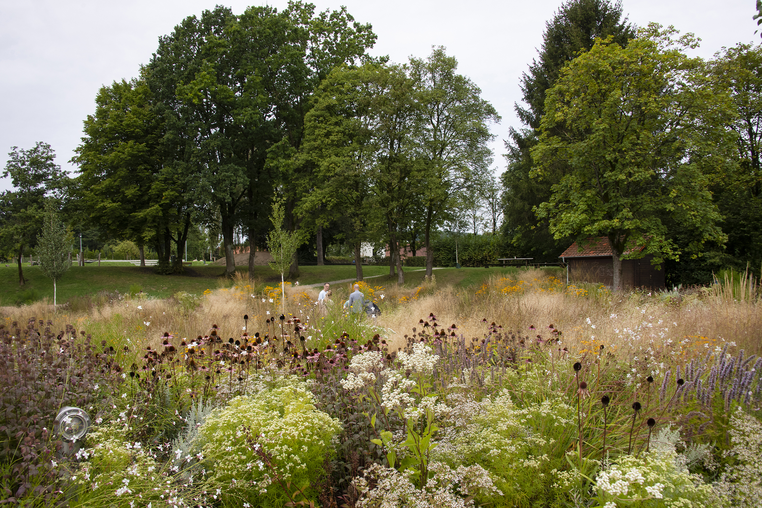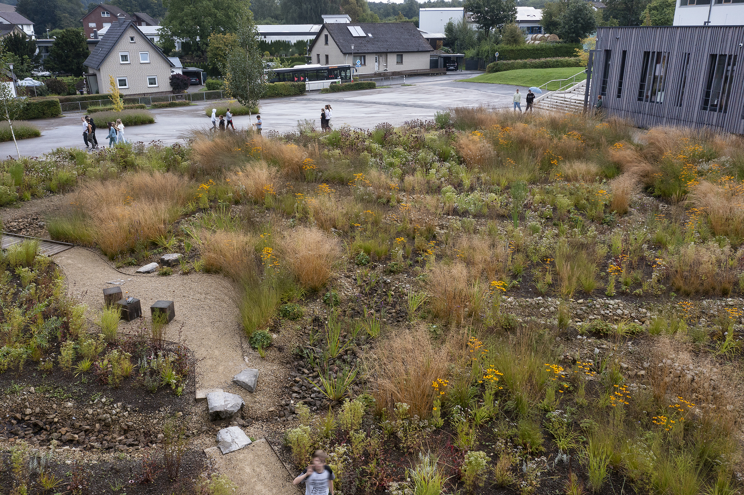 Im Rahmen des Neubaus der Jacobischule wird ein Flügel des alten Schulbaus abgerissen. Mit diesem Abriss wird eine neue Fläche geschaffen, die nun als Mehrgenerationenpark für die Schüler und Schülerinnen, aber auch für die Bürger der Gemeinde nutzbar gemacht wurde. Es gab eine Öffnung des Raums durch Reduzierung des Unterholzes, eine Bespielung mit zurückhaltenden Spielelementen sowie großzügige Sitzstufen in einem Böschungsbereich, die den Blick öffnen auf den tiefer liegenden „Klimapark“. Dieses „Highlight“ der Anlage hat die Anpassung an den Klimawandel als Grundgedanken. Anfallende Regenmengen und Starkregen werden in offenen Mulden mit Kieskörper aufgefangen und versickern vor Ort oder werden im Starkregenfall abgepuffert in den Kanal abgeführt. Zahlreiche Blühpflanzen geben eine zusätzliche Möglichkeit zur Verdunstung und dienen als Nährboden für heimische Insekten.
