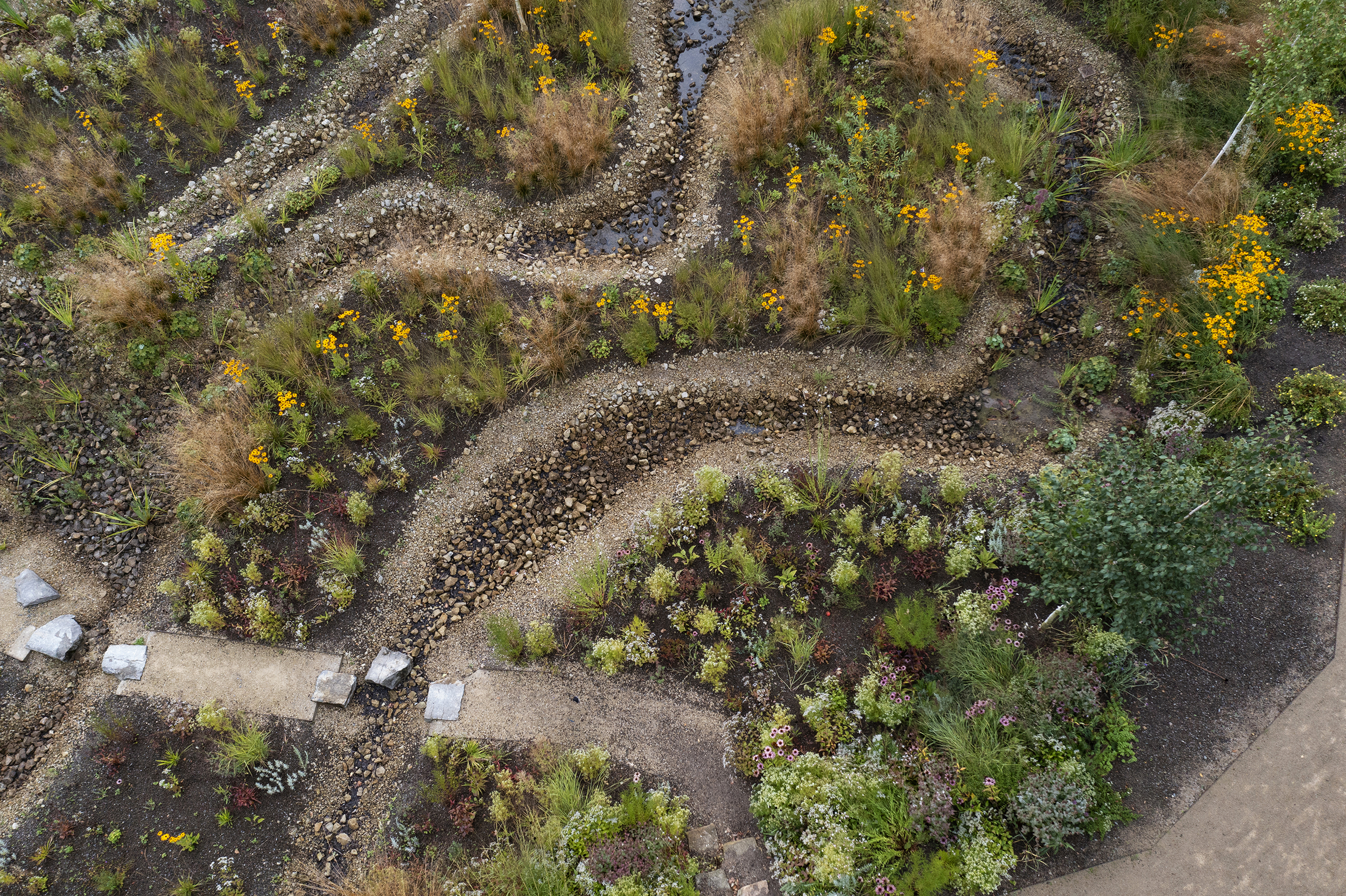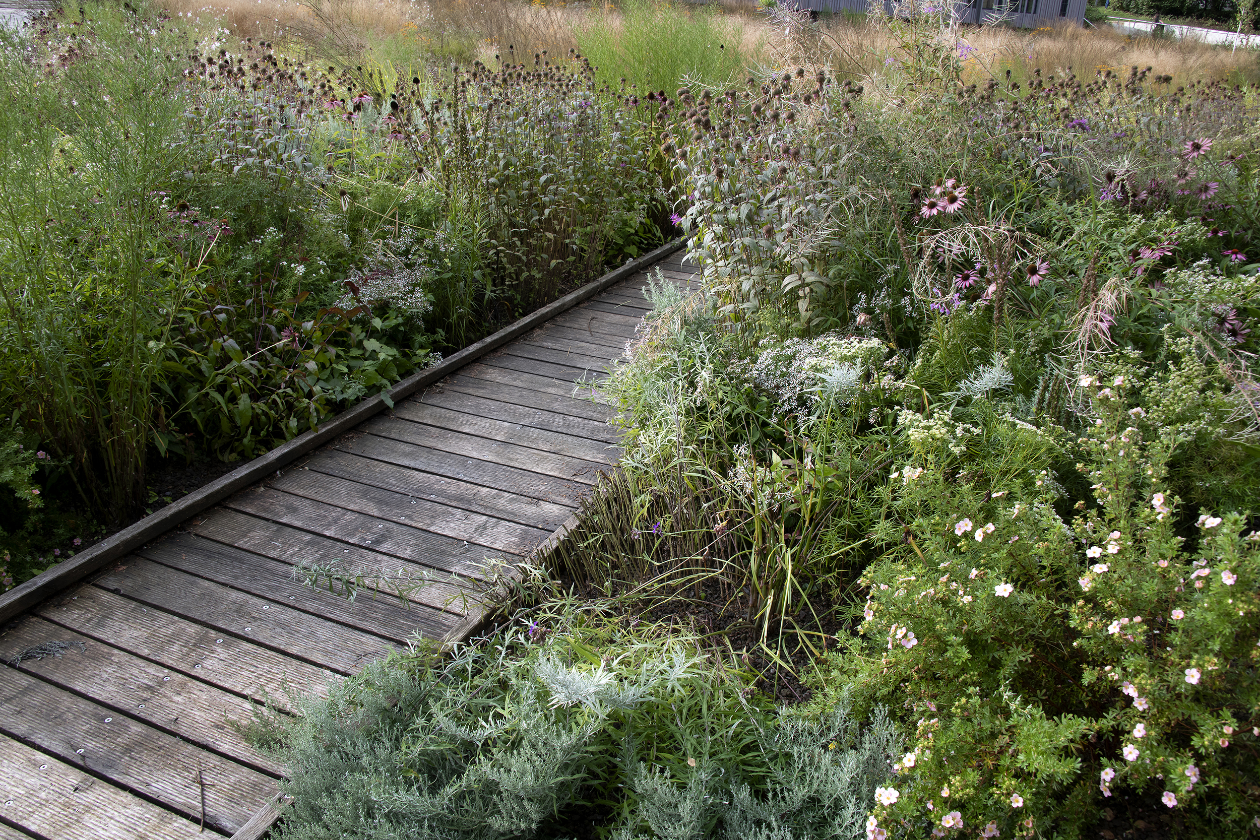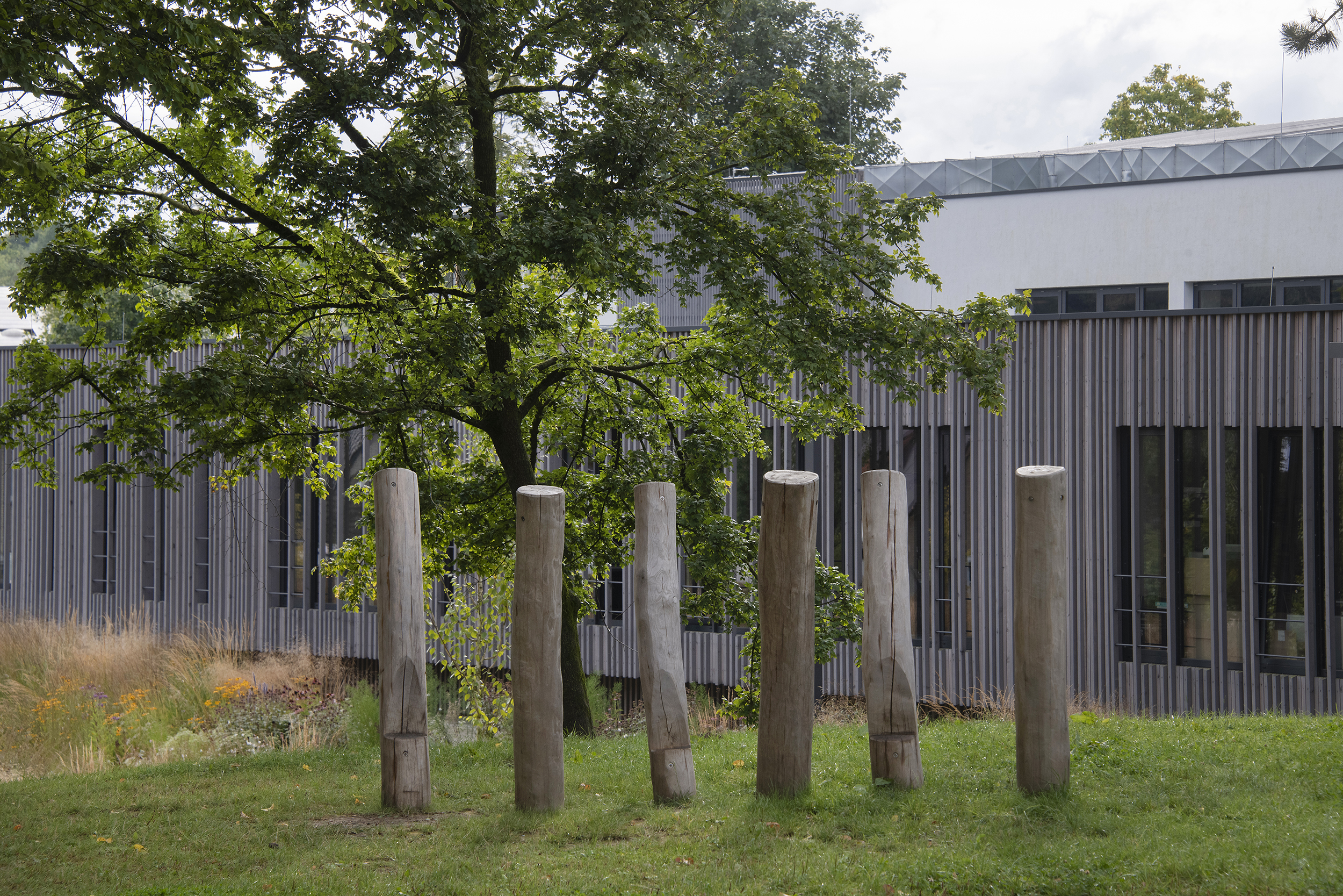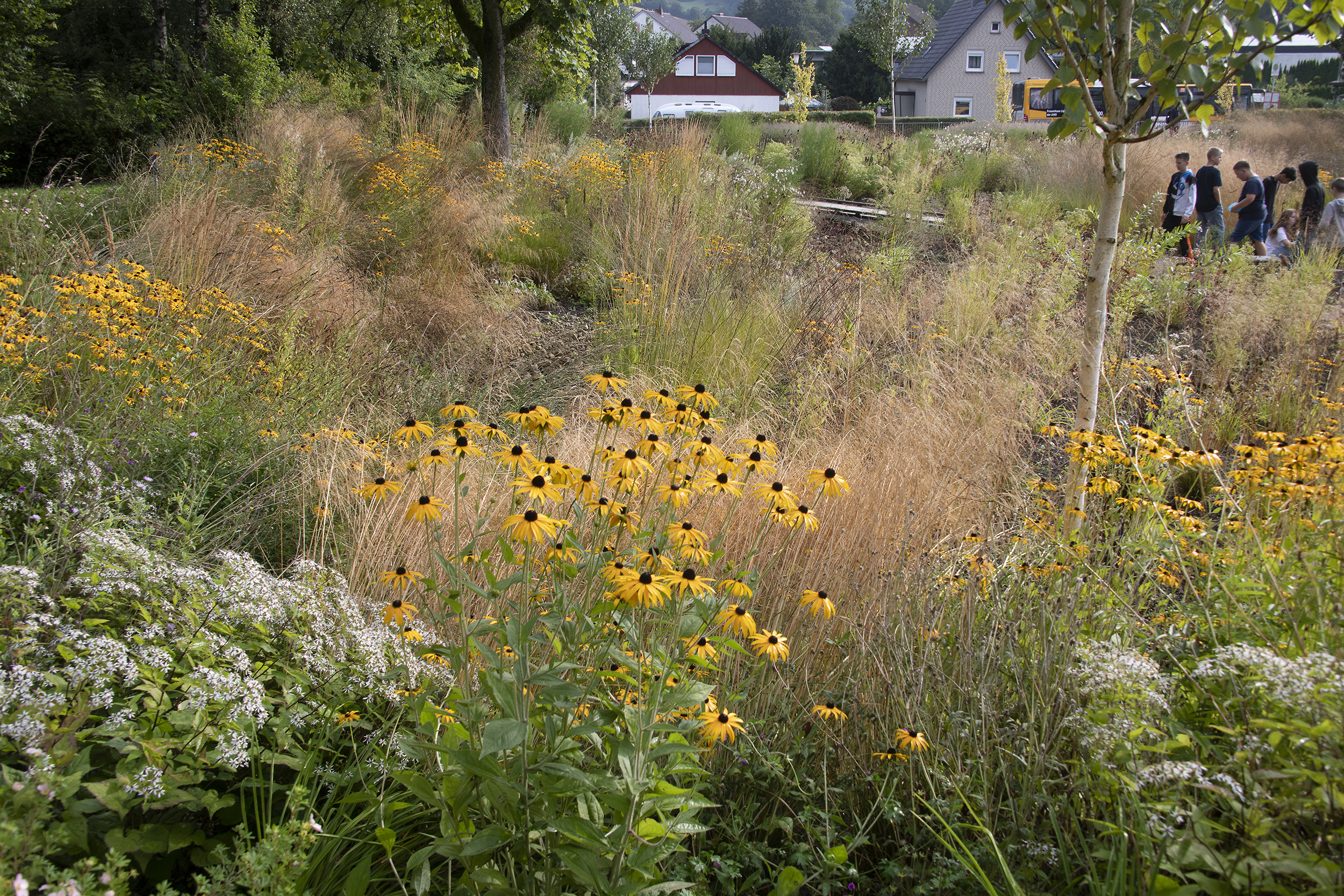 Im Rahmen des Neubaus der Jacobischule wird ein Flügel des alten Schulbaus abgerissen. Mit diesem Abriss wird eine neue Fläche geschaffen, die nun als Mehrgenerationenpark für die Schüler und Schülerinnen, aber auch für die Bürger der Gemeinde nutzbar gemacht wurde. Es gab eine Öffnung des Raums durch Reduzierung des Unterholzes, eine Bespielung mit zurückhaltenden Spielelementen sowie großzügige Sitzstufen in einem Böschungsbereich, die den Blick öffnen auf den tiefer liegenden „Klimapark“. Dieses „Highlight“ der Anlage hat die Anpassung an den Klimawandel als Grundgedanken. Anfallende Regenmengen und Starkregen werden in offenen Mulden mit Kieskörper aufgefangen und versickern vor Ort oder werden im Starkregenfall abgepuffert in den Kanal abgeführt. Zahlreiche Blühpflanzen geben eine zusätzliche Möglichkeit zur Verdunstung und dienen als Nährboden für heimische Insekten.