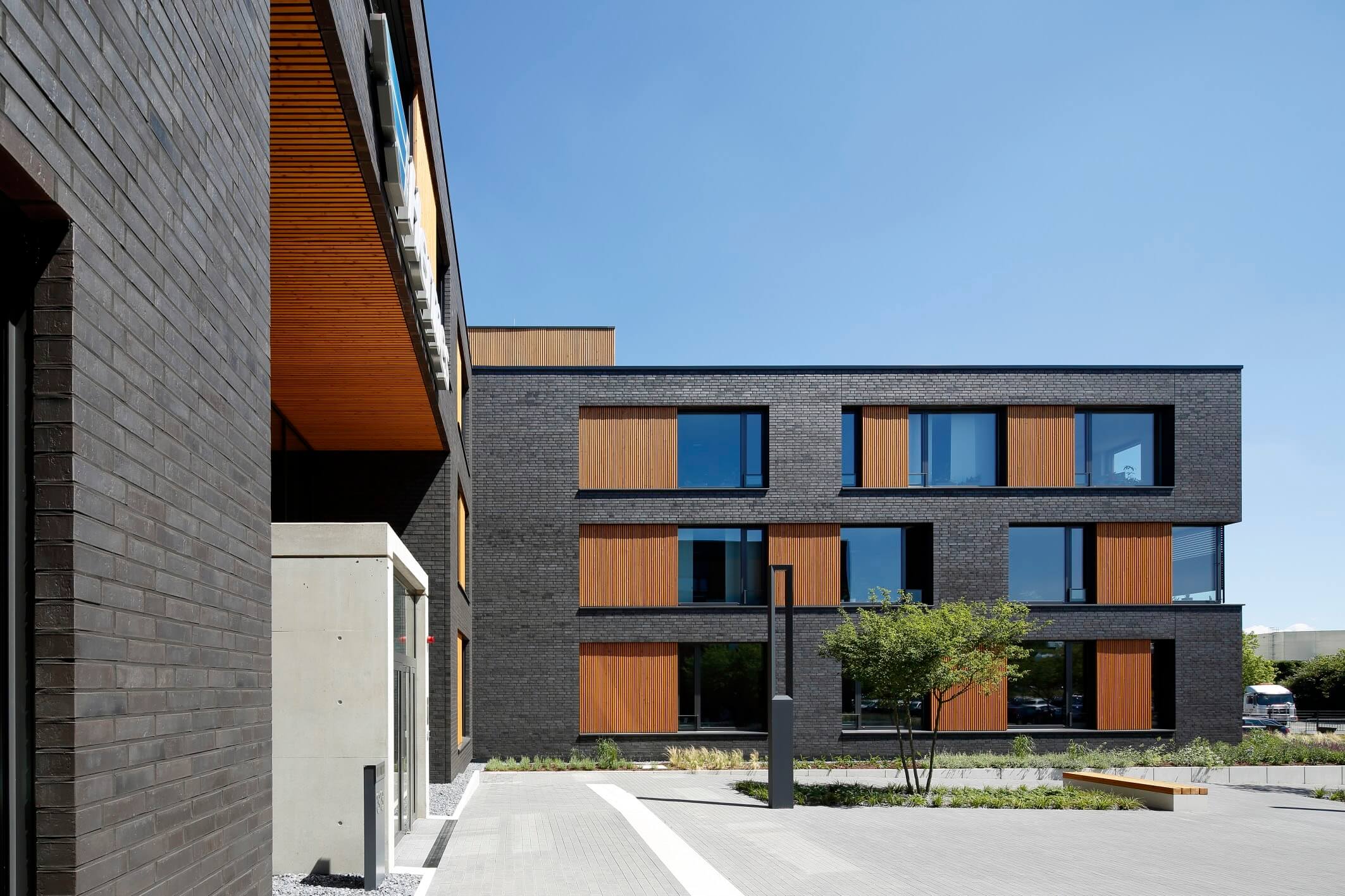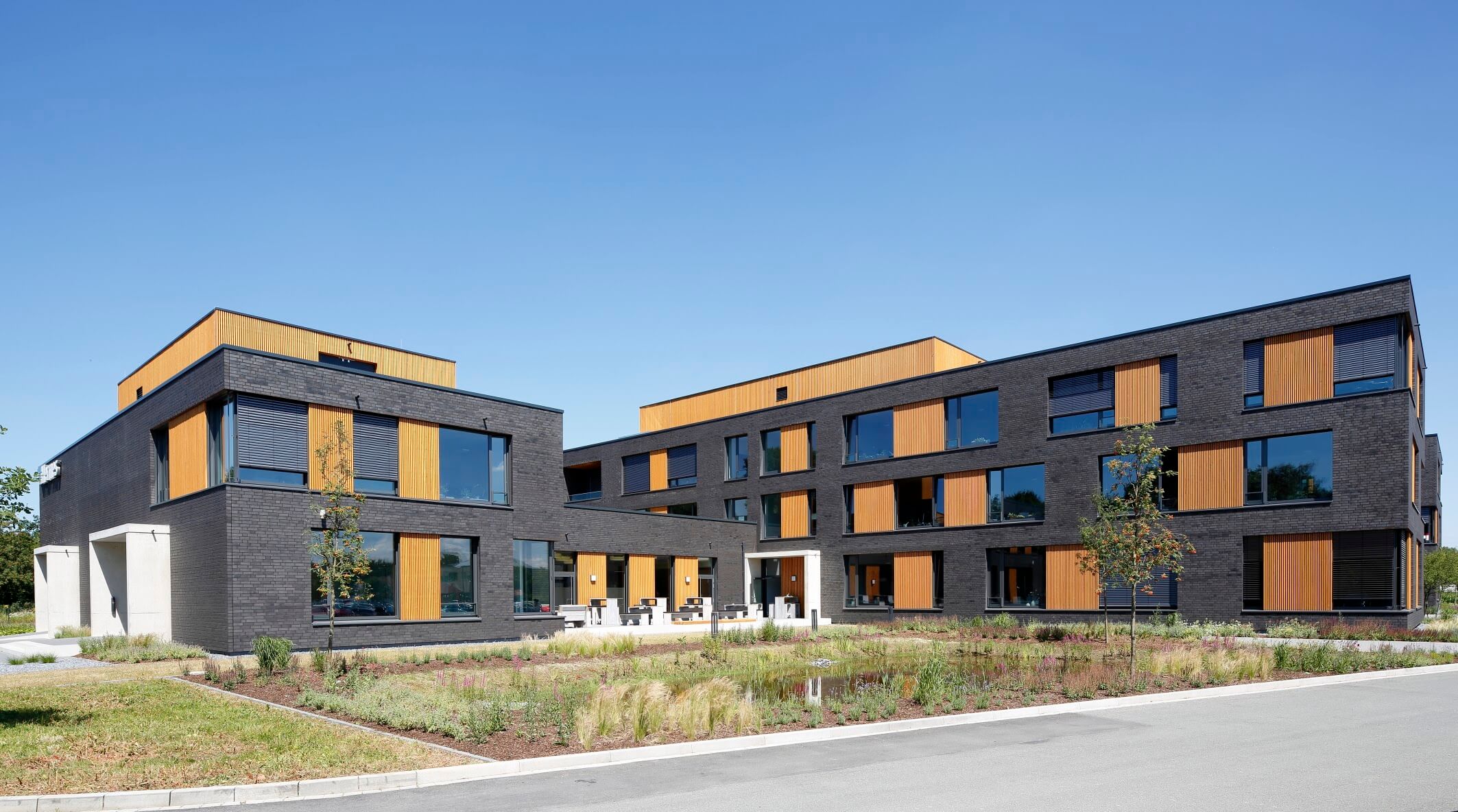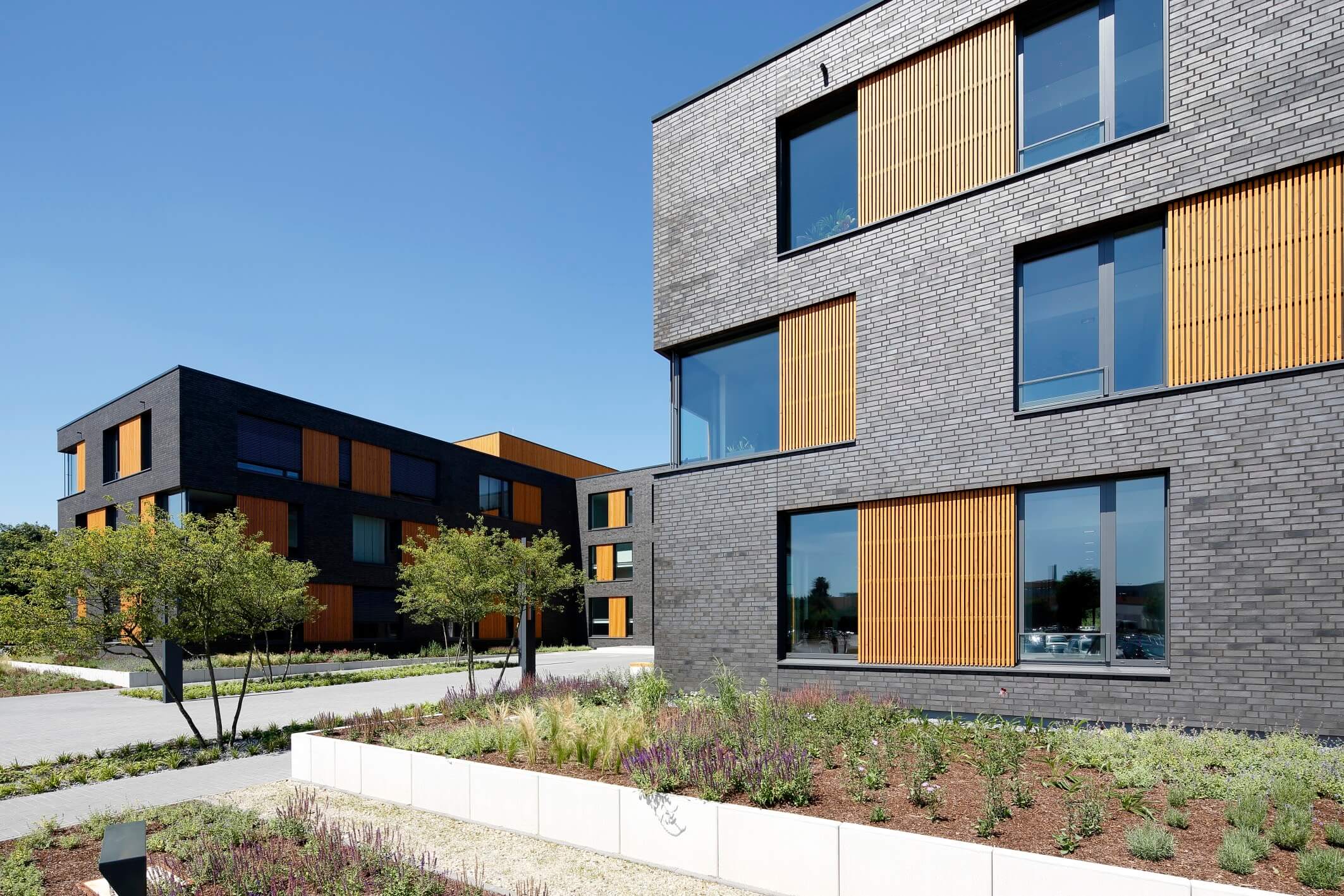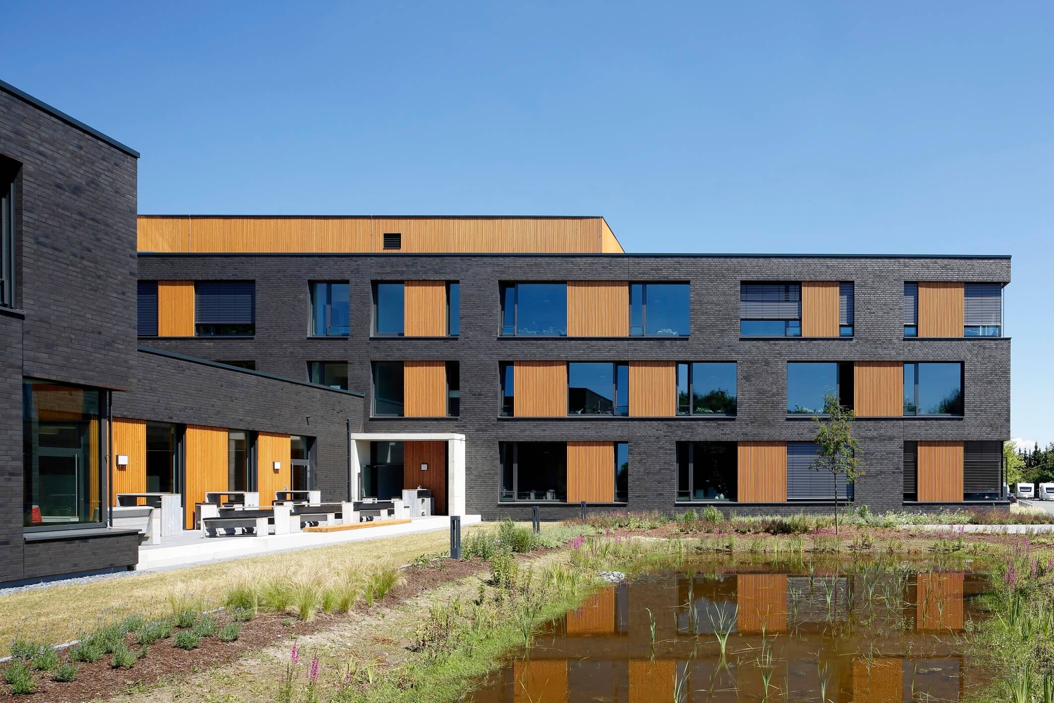 Schlussendlich war es aufgrund eines standortbedingt fehlenden Anschlusses an das städtische Kanalnetz erforderlich, sämtliche in den Freianlagen und auf den Dächern anfallende Niederschlagswässer auf dem Grundstück einer geordneten Versickerung zuzuführen. Dies erfolgt über offene Becken und z. T. unter Verkehrsflächen liegenden Rigolen.