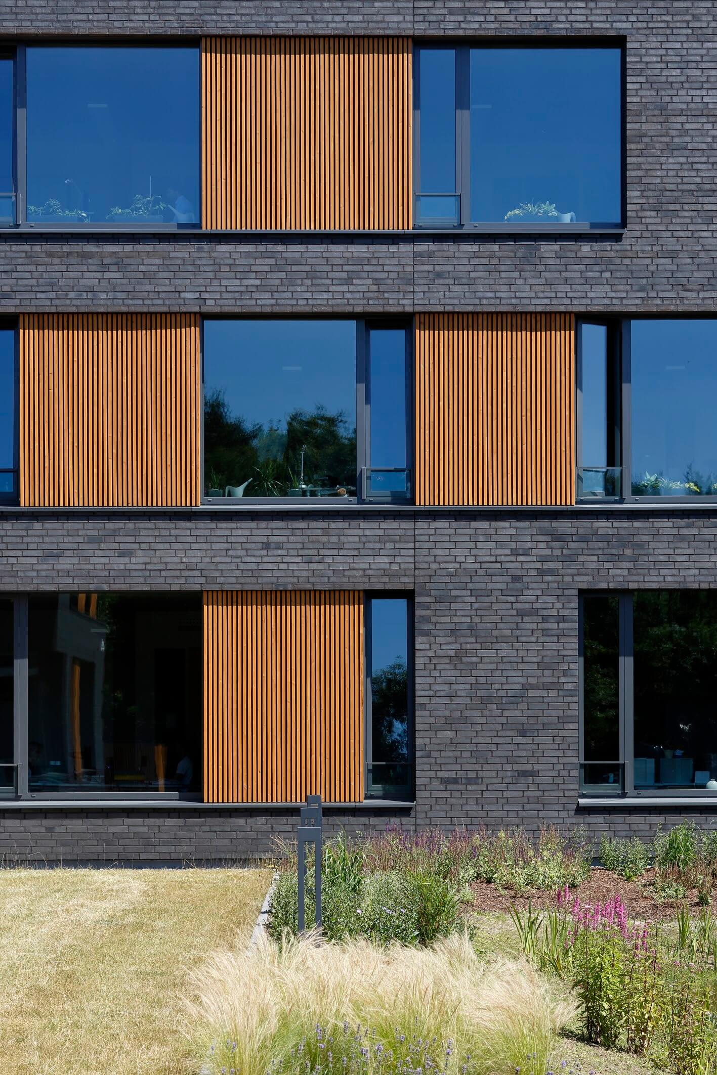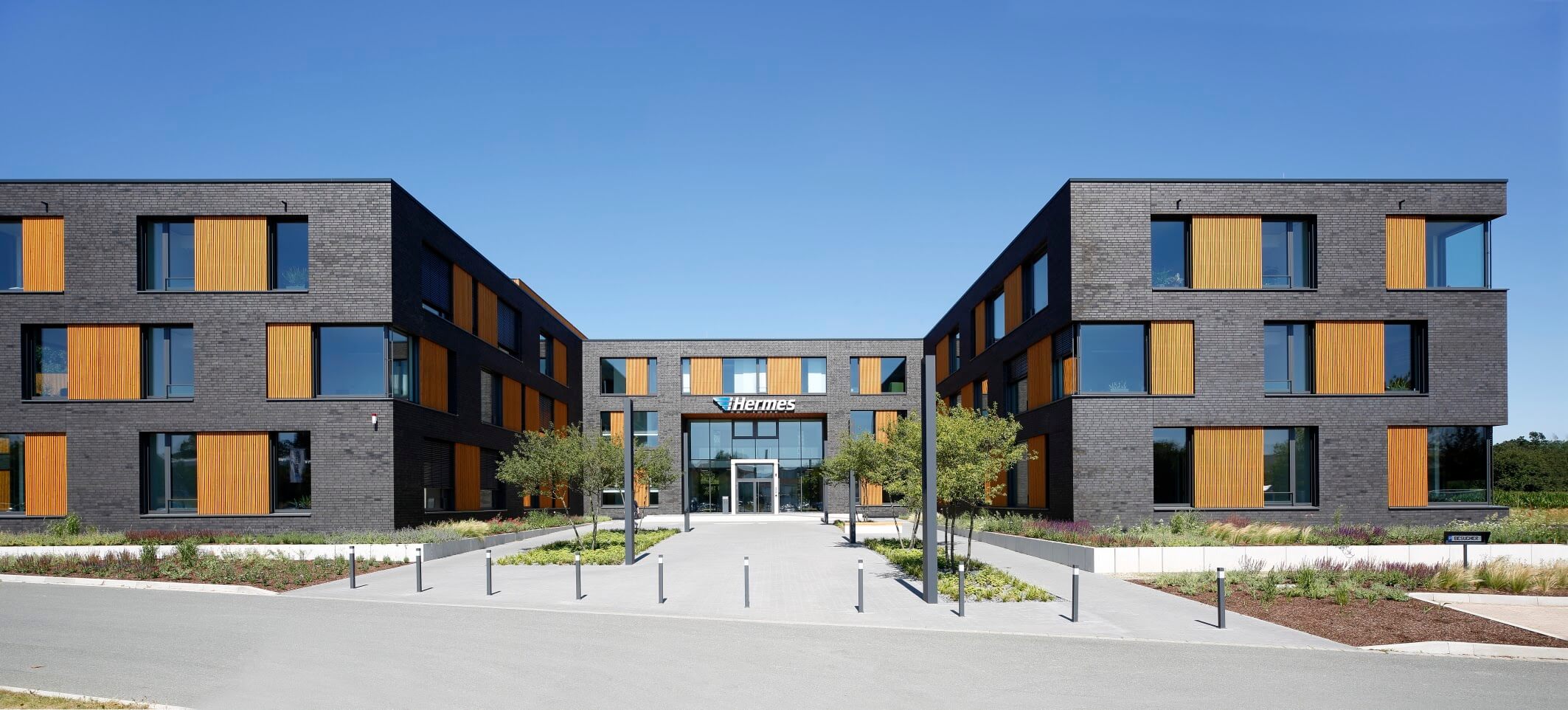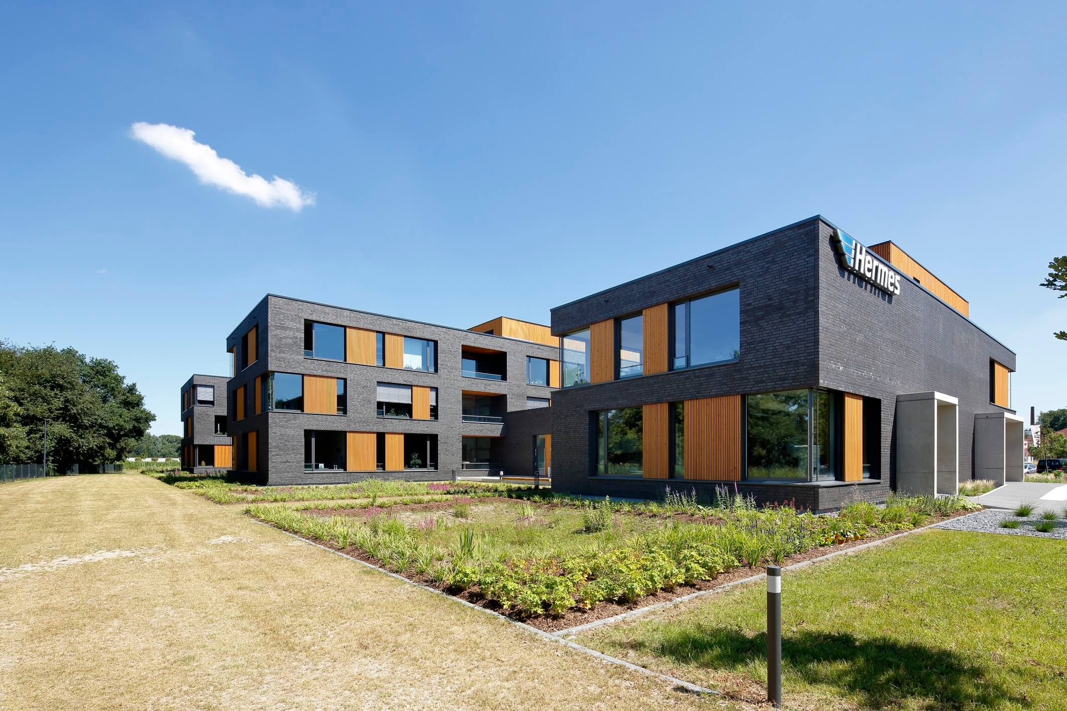 Die Lage dieses in der Werreaue in Löhne gelegenen Bürogebäudes bot drei planerische Herausforderungen. Zum einen musste aufgrund der ökologisch sensiblen Lage in der Aue schon in der Planung eine Vielzahl an – mit den Naturschutzbehörden abgestimmten – Kompensationsmaßnahmen berücksichtigt werden. Befestigte Flächen wurden zudem auf ein Mindestmaß reduziert. Die Pflanzungen wurden überwiegend als Staudenmischpflanzungen erstellt und zeigen insbesondere in der Fuge zwischen Gebäude und Werre einen eher extensiven Charakter. Zum anderen mussten die gesamten Freianlagen hochwassersicher ausgebaut werden.