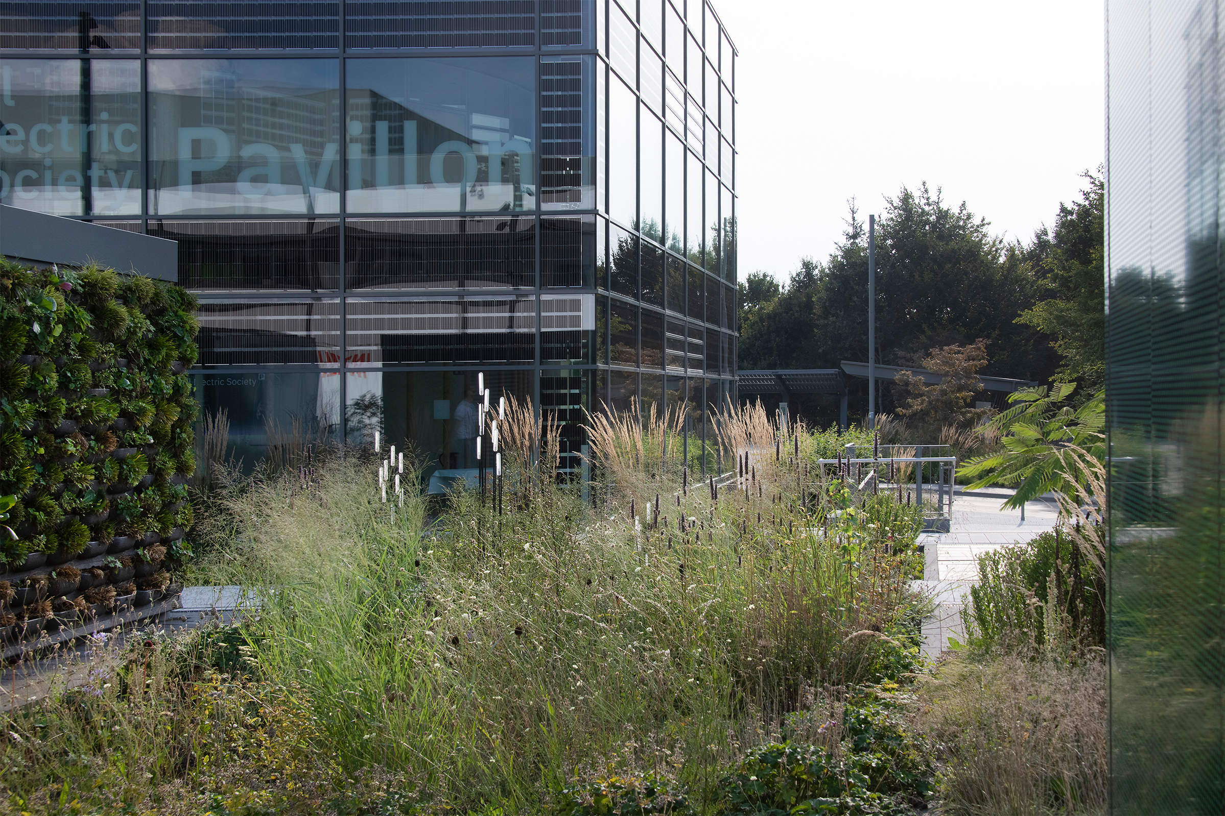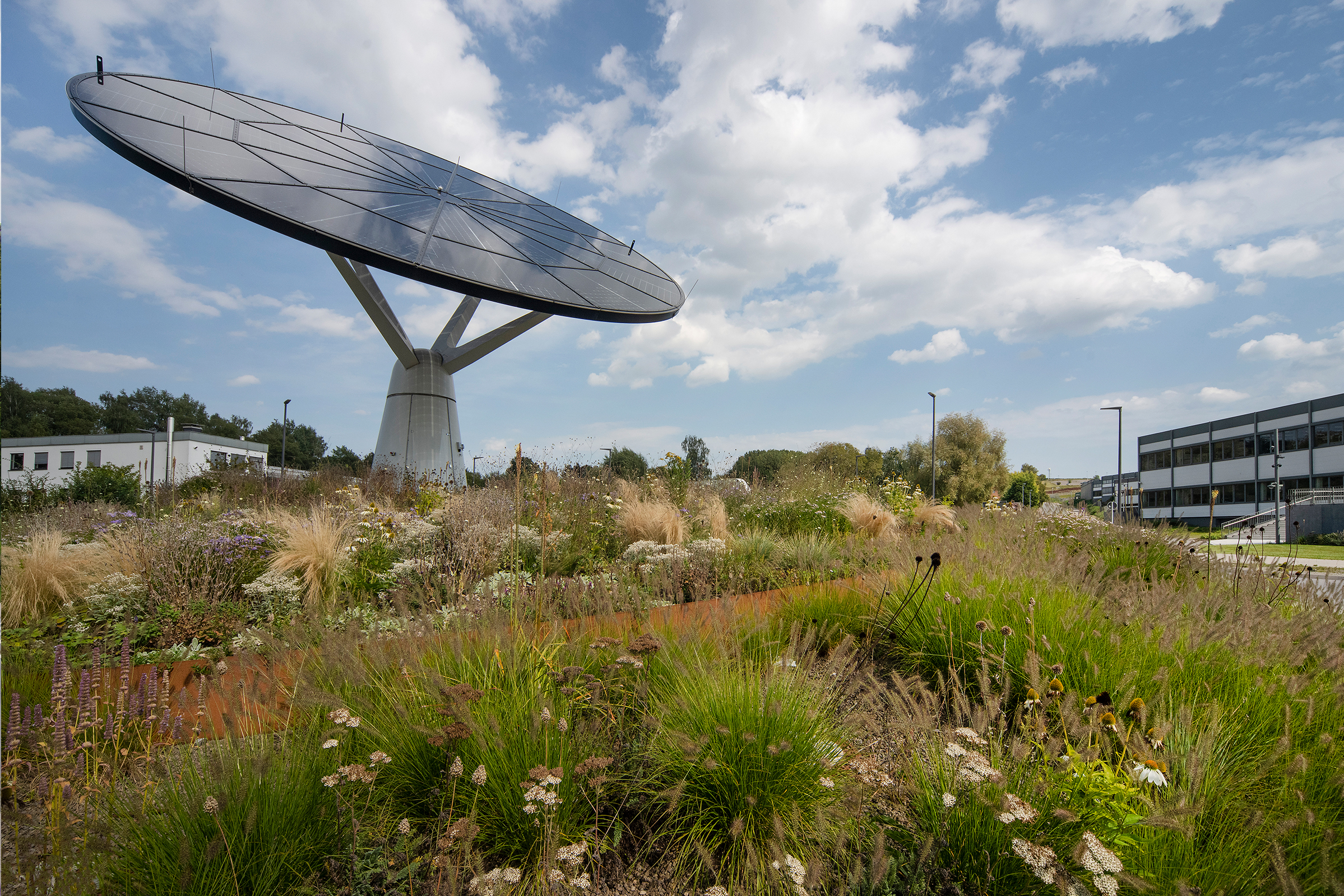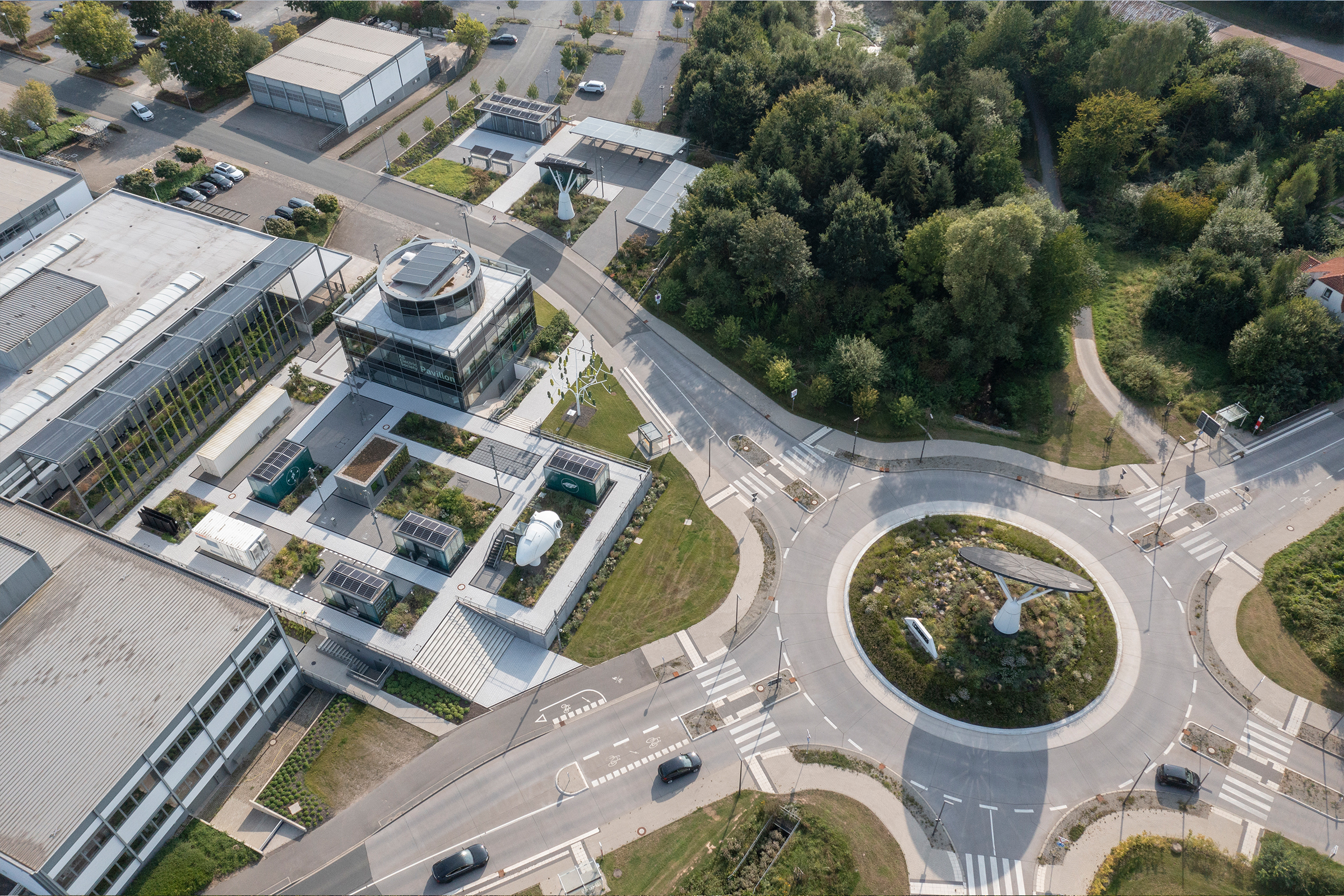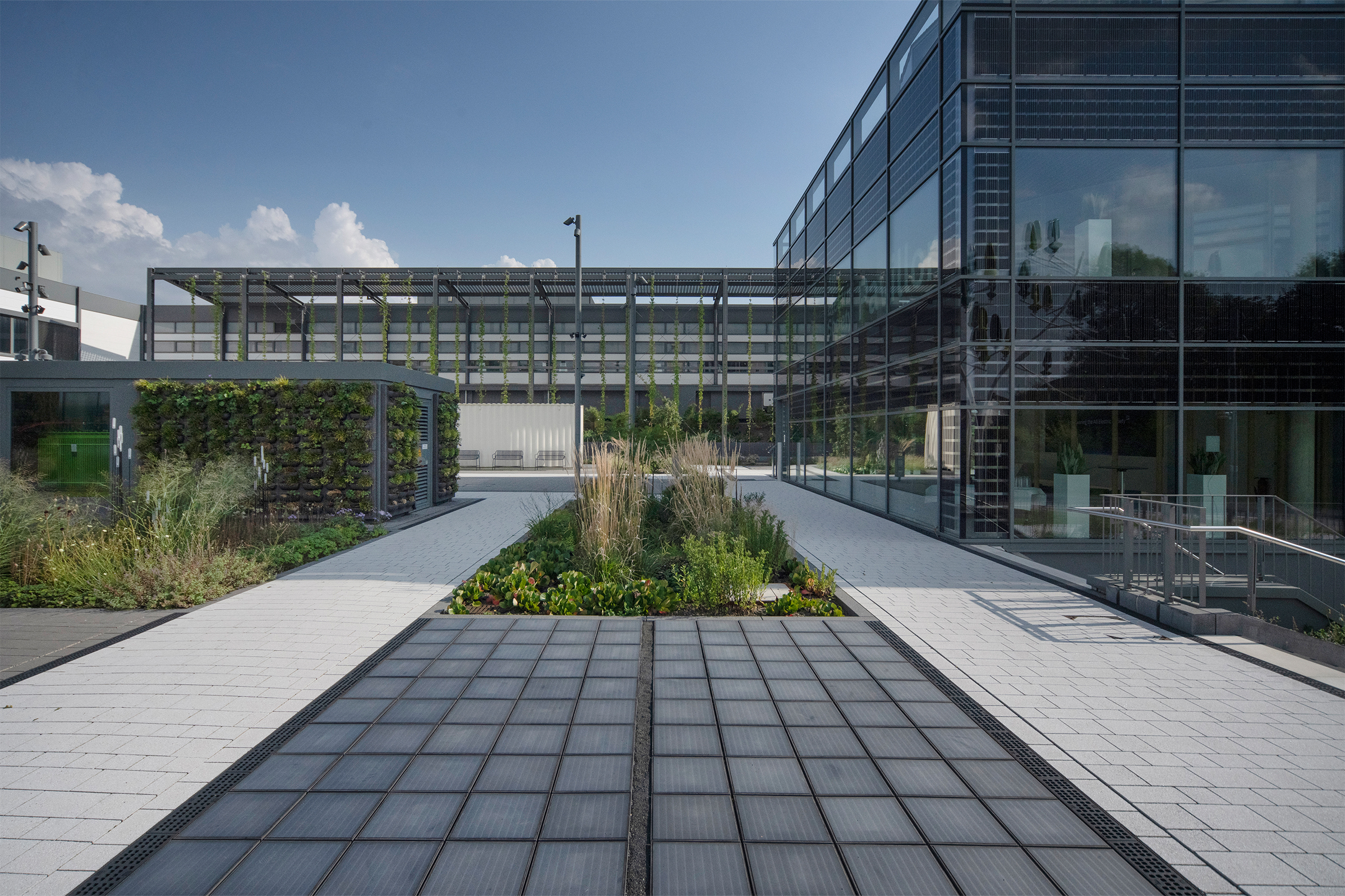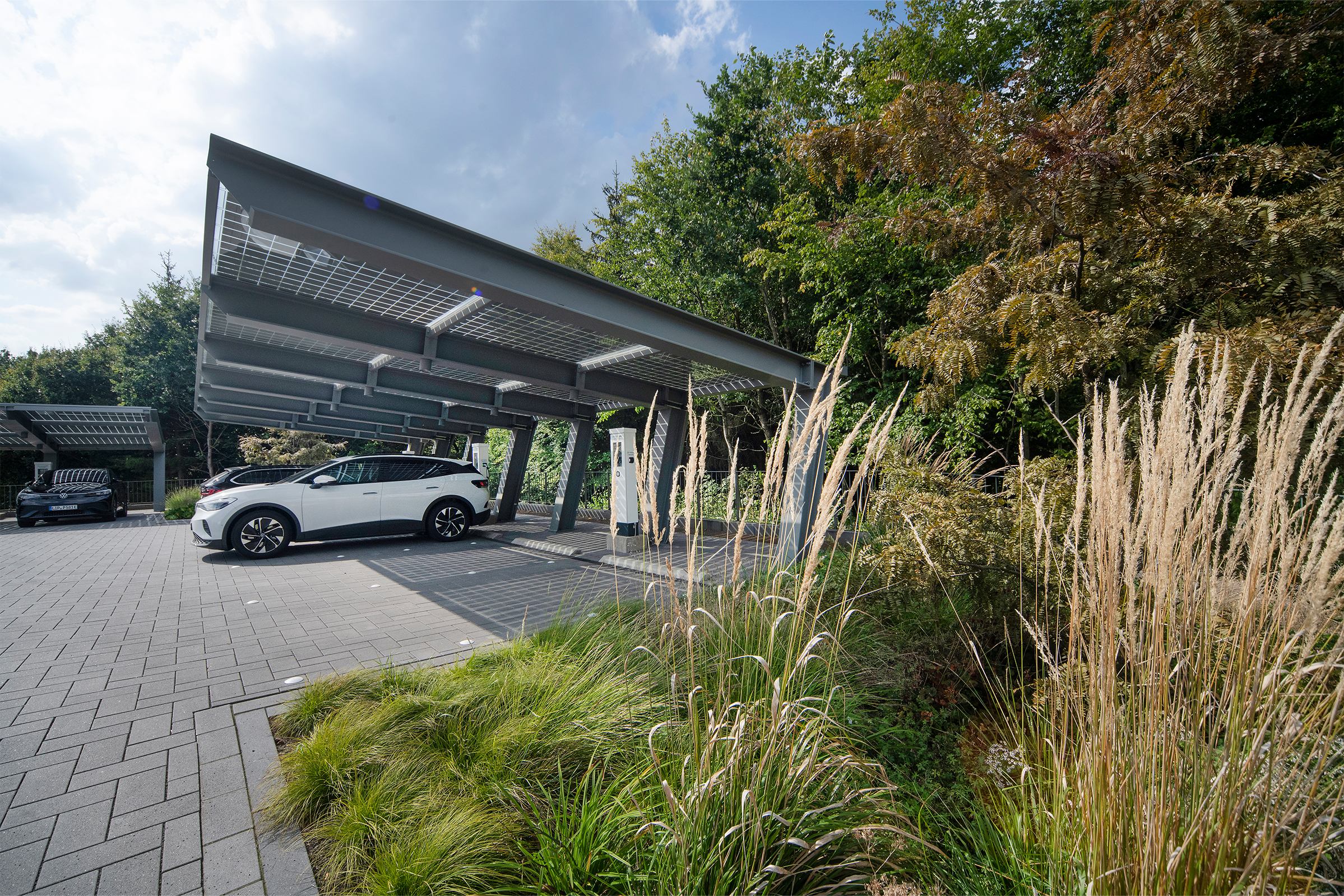 Die Ausstellungsfläche dient zur Präsentation des Zukunftsbildes der „All Electric Society“ – der Leitgedanke des Unternehmens Phoenix Contact. Der Park bettet die Ausstellungselemente funktional, gestalterisch und ökologisch hochwertig in ein. Klimaangepasste Staudenbeete und Kletterpflanzen an der neuen Stahlkonstruktion begrünen den Park und sorgen für Biodiversität. Abwasserbehandelnder Pflasterbelag und eine Solarpflasterfläche unterstützen den Nachhaltigkeitsgedanken. Im Kreisverkehr modellieren Cortenstahlbänder die bepflanzten Flächen und setzen den Solartree in Szene.