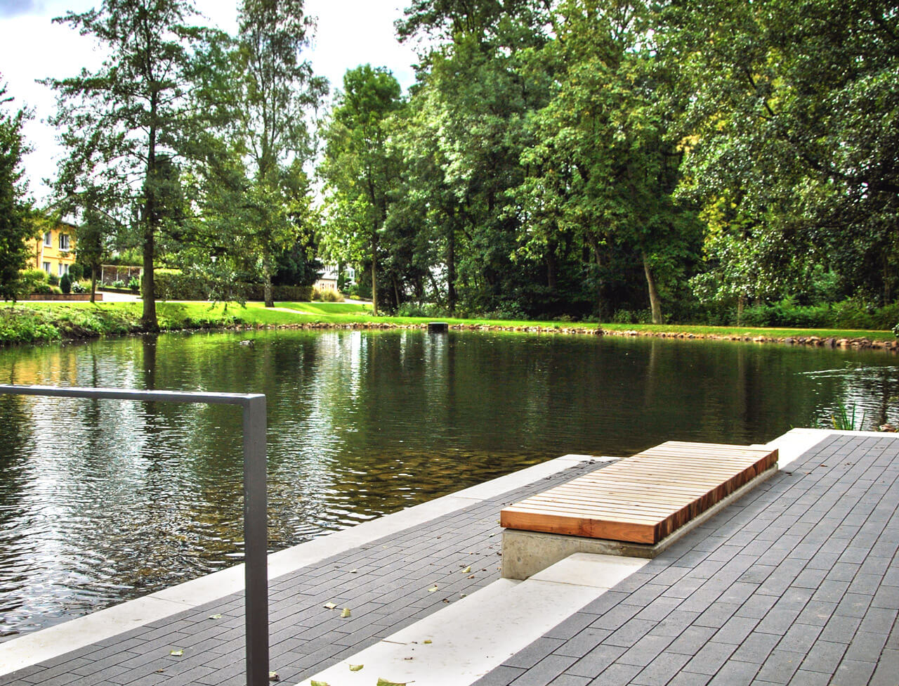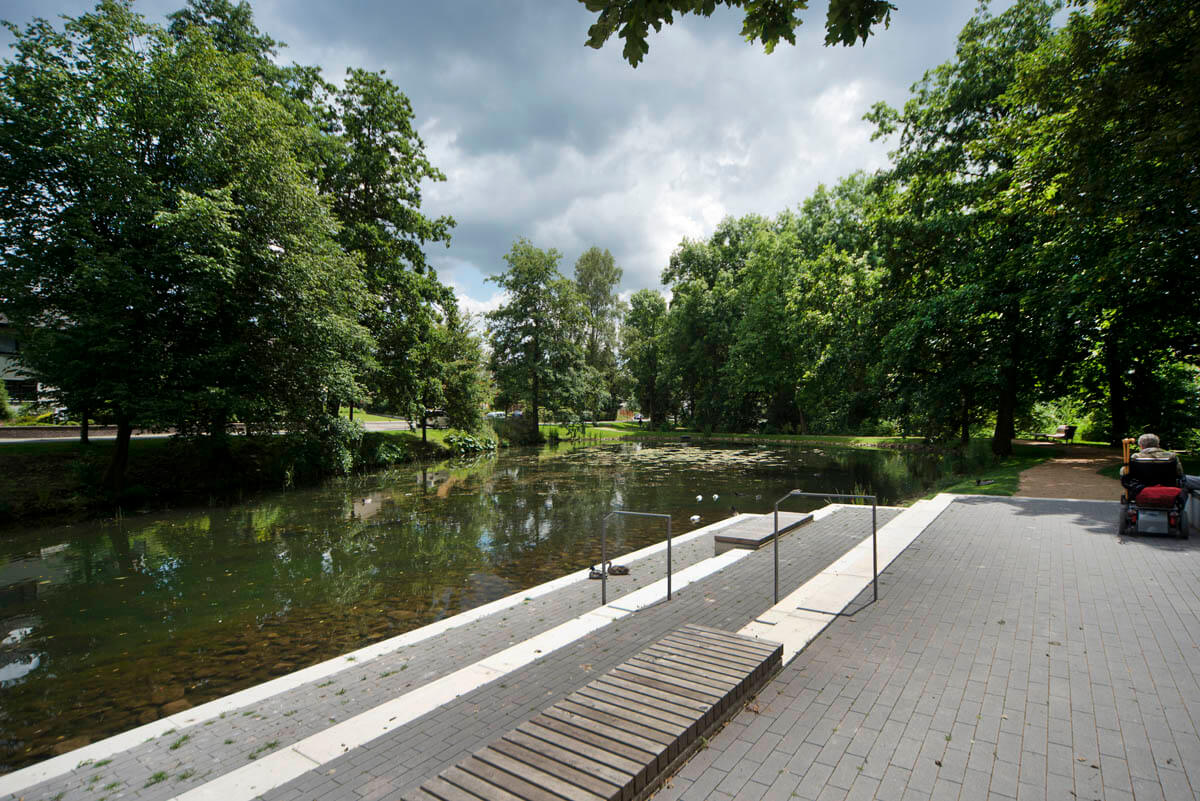 Als zentraler Anziehungspunkt befindet sich am Ende der Brücke eine Teichtreppe mit Sitzmöglichkeiten und Zugang zum Wasser.