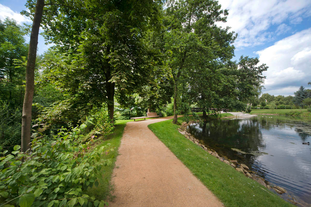 Gegenüber des neuen Rathauses der Gemeinde Dörentrup, zwischen Poststraße und Mühlenstraße, liegt eine als Park gestaltete Grünfläche am Hillbach.