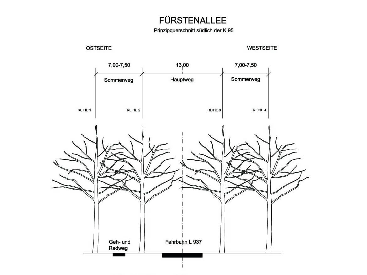 Die Fürstenallee wurde um 1730 als Eichenallee in Schlangen (Kreis Lippe) im Anschluss an eine alte Passstraße angelegt. Sie bildet ein repräsentatives Denkmal des Barocks. Aufgrund diverser negativer Einflüsse der Vergangenheit (Nutzung, Pflege, etc.) wurde das Erscheinungsbild der 4-reihigen Allee stark beeinträchtigt. Zur langfristigen Sicherung und Wiederherstellung der historischen Fürstenallee wurde von unserem Büro eine Neu- und Entwicklungsplanung für ein 2,5 km langes Teilstück entlang der L 937 erarbeitet. Die Entwicklungsplanung wurde im Rahmen eines von unserem Büro moderierten dialogorientierten Beteiligungsverfahrens mit den Eigentümern, Verbänden und den Trägern öffentlicher Belange abgestimmt. Ergebnis des Beteiligungsverfahrens ist ein verbindliches Handlungskonzept mit Festlegung von Realisierungsabschnitten und konkreten Handlungsanweisungen (Ausführungsplanung für Teilabschnitte), das die Ansprüche der Erholungsnutzung, der Verkehrssicherheit, des Artenschutzes sowie des Denkmalschutzes erfüllt.