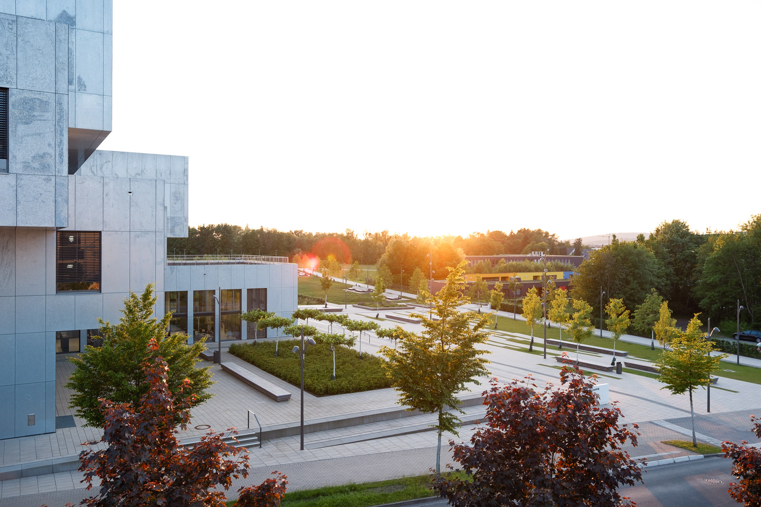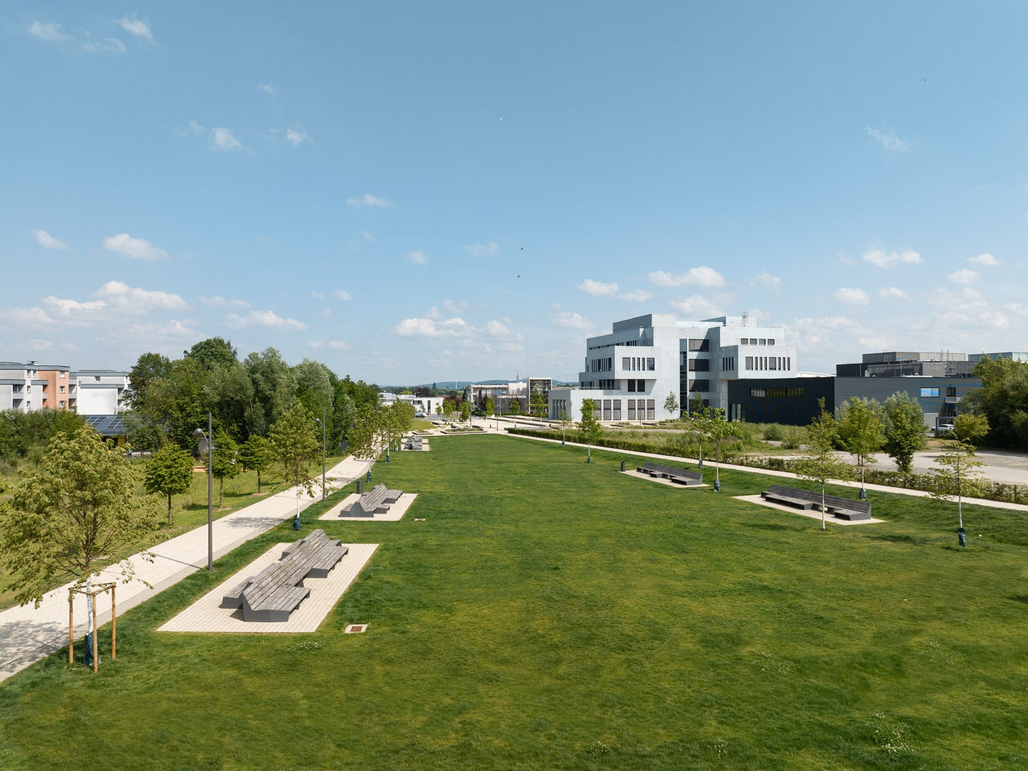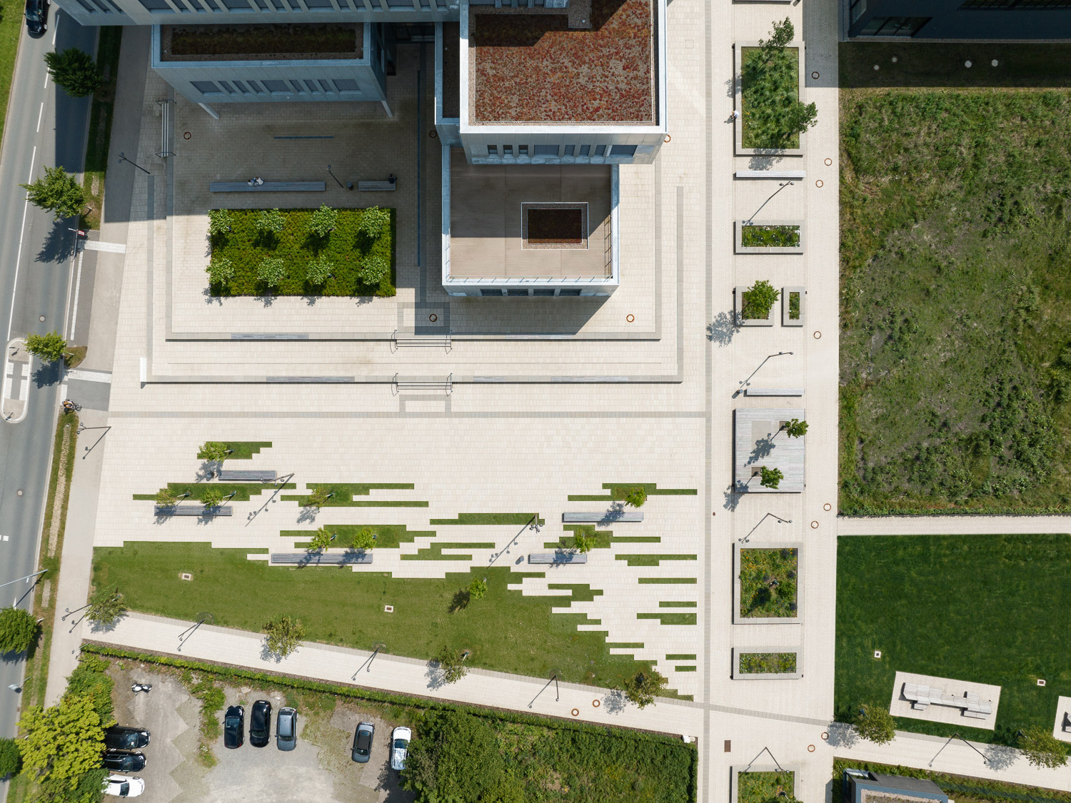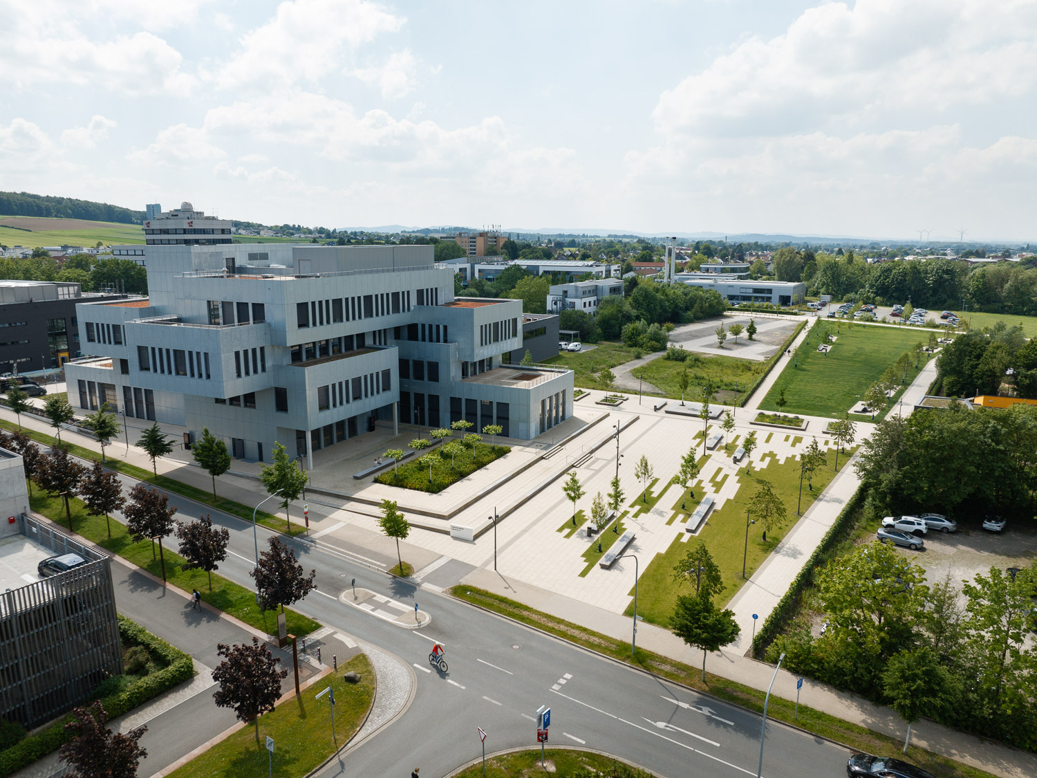 In Anlehnung an die städtebauliche Masterplanung wurde das gesamte Gelände des Innovation Campus neu strukturiert. Die isolierte Lage im Stadtraum wurde aufgebrochen. Zahlreiche – auch boulevardähnlich ausgebildete Wege – vernetzen das Gelände mit den umliegenden Wohngebieten, der Hochschule und der Altstadt. Entlang der Wege und im Umfeld des neuen Innovation Spin bieten vielfältig strukturierte Freiflächen unzählige Möglichkeiten zur Bewegung, zum Aufenthalt und zum Sport im Grünen; im Alltag, aber auch bei großen Veranstaltungen im universitären und städtischen Rahmen. Der Versiegelungsgrad wurde so gering wie möglich gehalten.
