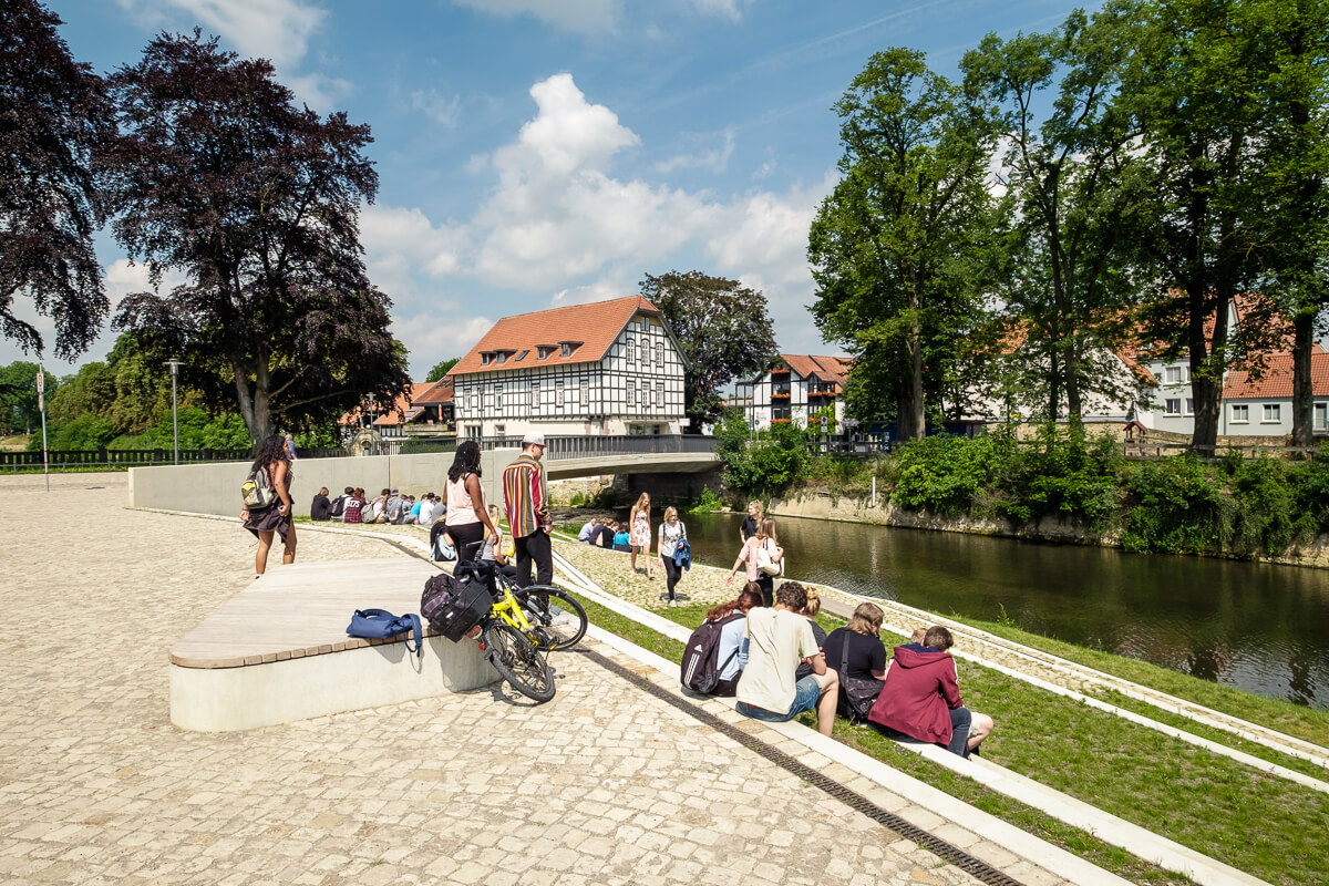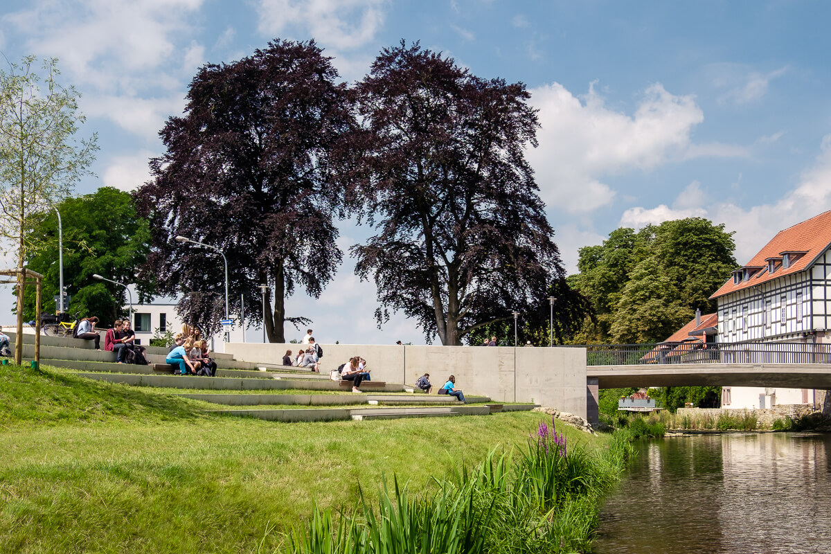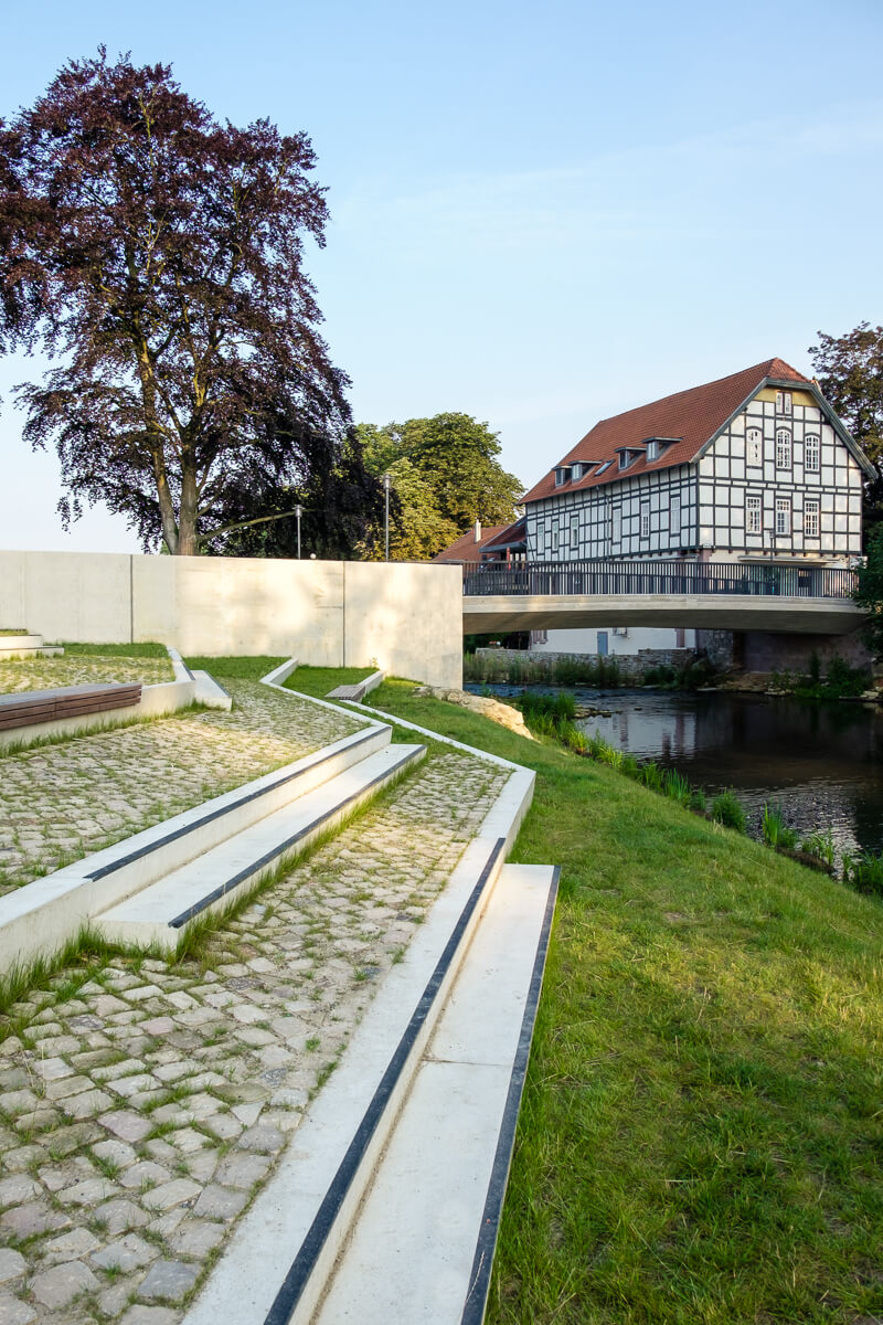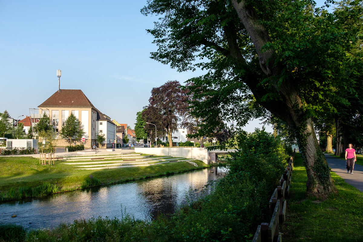Im Zusammenhang mit der Hochwasserschutzplanung wurde die Durchgängigkeit der Bega wieder hergestellt. Teil dieser übergeordneten Maßnahme ist die Beseitigung des Mühlenwehres einschließlich des Brückenbauwerks am Langenbrücker Tor. Durch den Abriss und Neubau der Brücke hat sich die Chance eröffnet, die Zugänglichkeit und Erlebbarkeit des Uferbereichs herzustellen bzw. zu verbessern. Eine großzügige Stufenanlage mit zahlreichen Sitzmöglichkeiten lädt zum Aufenthalt mit Blick auf die historische Wallanlage sowie Stadtsilhouette ein.