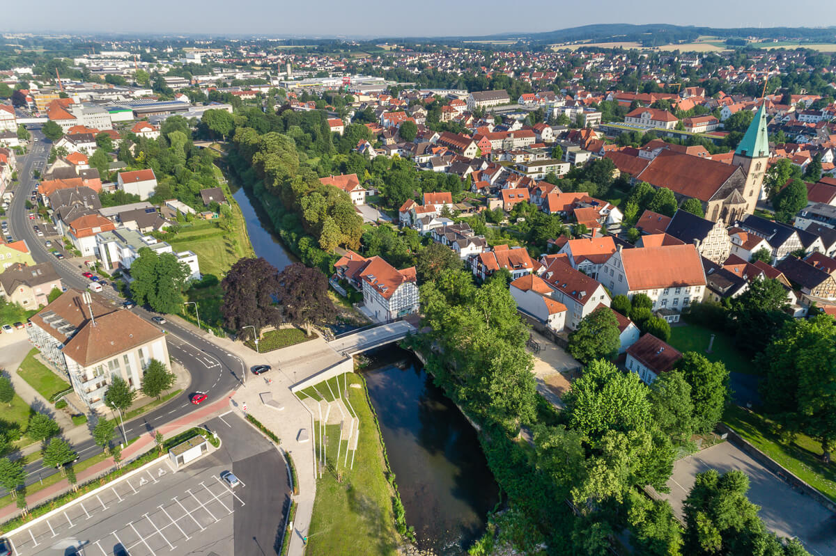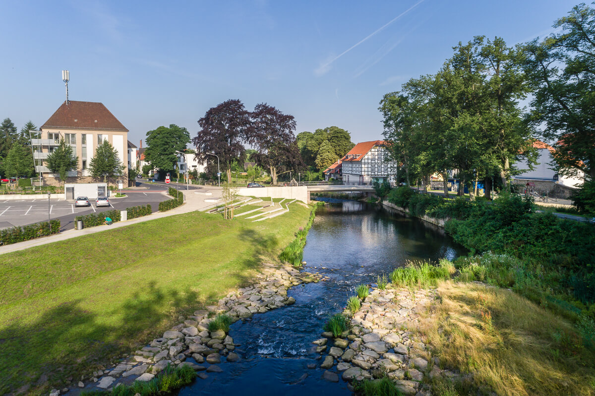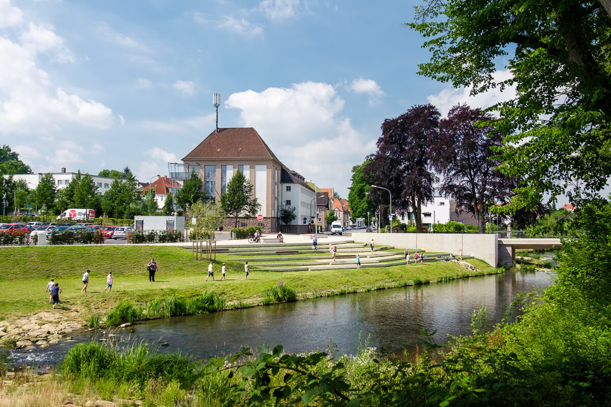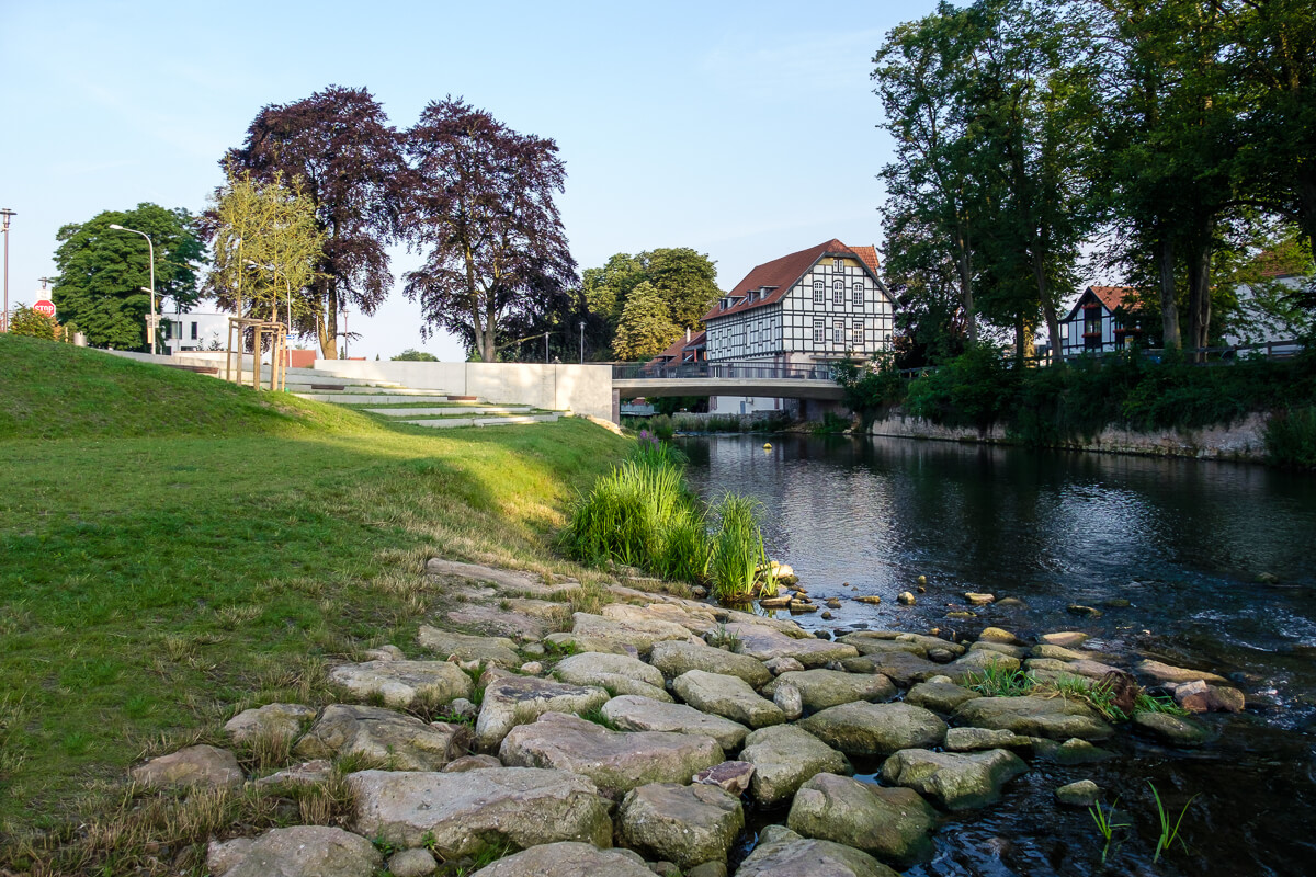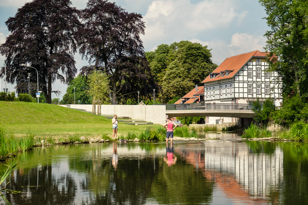 Im Zusammenhang mit der Hochwasserschutzplanung wurde die Durchgängigkeit der Bega wieder hergestellt. Teil dieser übergeordneten Maßnahme ist die Beseitigung des Mühlenwehres einschließlich des Brückenbauwerks am Langenbrücker Tor. Durch den Abriss und Neubau der Brücke hat sich die Chance eröffnet, die Zugänglichkeit und Erlebbarkeit des Uferbereichs herzustellen bzw. zu verbessern. Eine großzügige Stufenanlage mit zahlreichen Sitzmöglichkeiten lädt zum Aufenthalt mit Blick auf die historische Wallanlage sowie Stadtsilhouette ein.