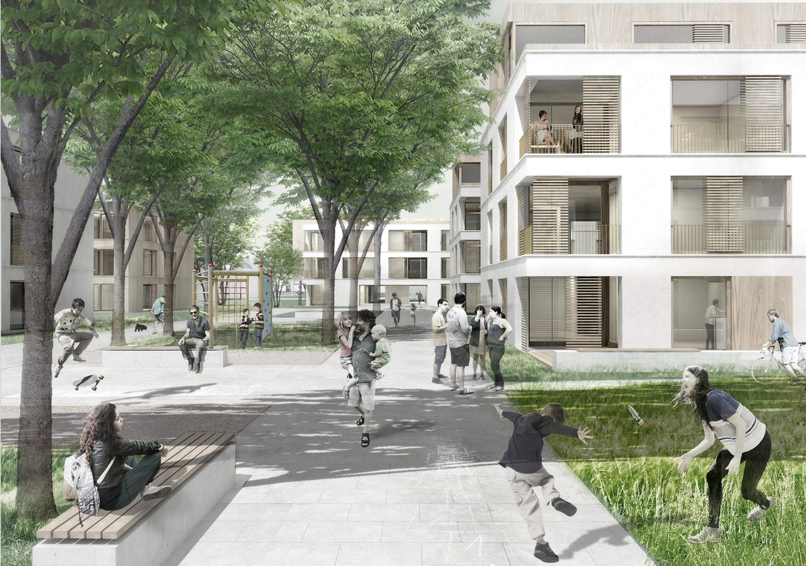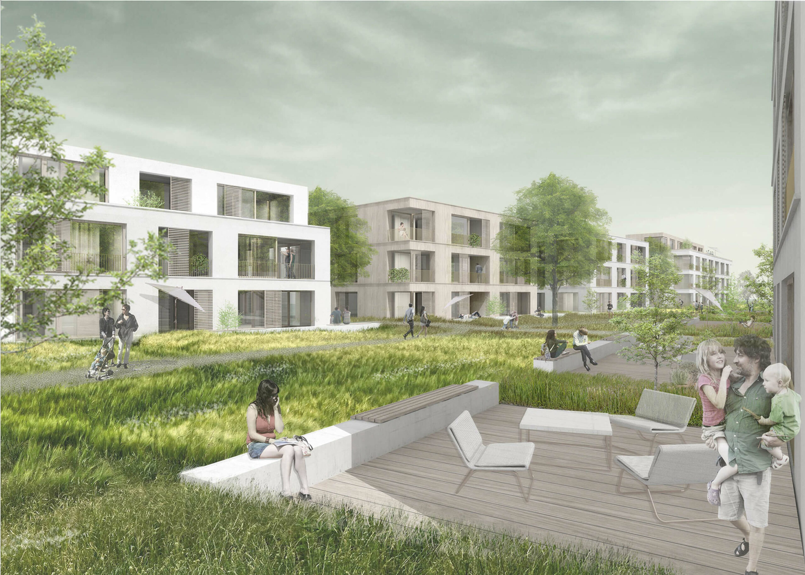 Der freiraumplanerische Grundgedanke für den Außenraum folgt der städtebaulichen Philosophie des Wettbewerbsbeitrages. Die Ausbildung einer „Grünen Mitte“ fügt alle Bereiche und Gebäudestrukturen zu einem gemeinsamen Quartierszentrum räumlich zusammen. Den Übergang zwischen öffentlicher Mitte und privater Terrasse schaffen informelle, geschwungene Wege, die entwerferisch die linearen Strukturen der Gebäudekanten aufbrechen und den Anwohner durch das Quartier wandeln lassen.