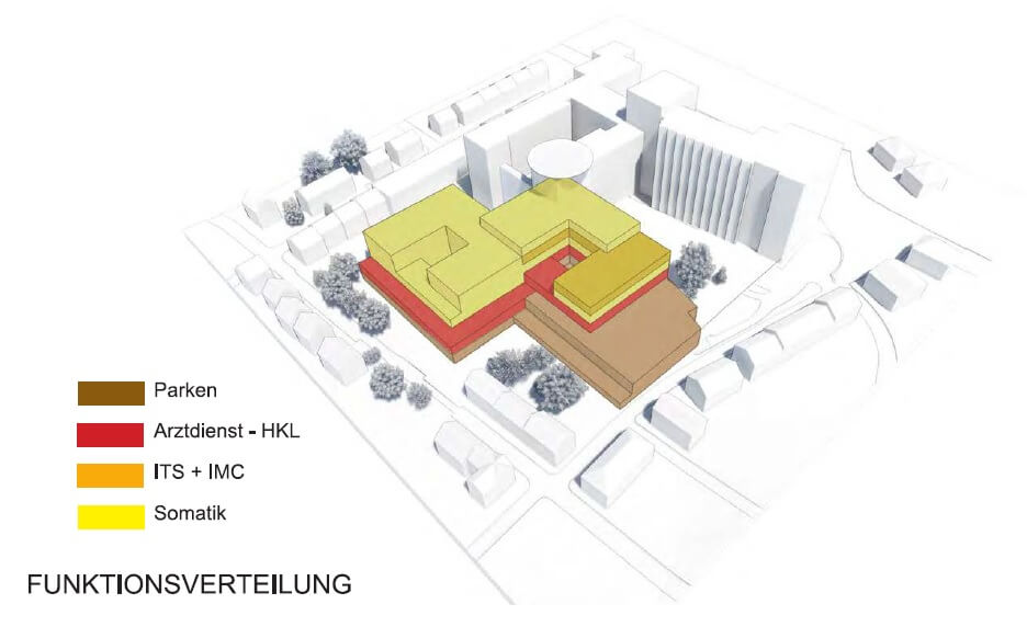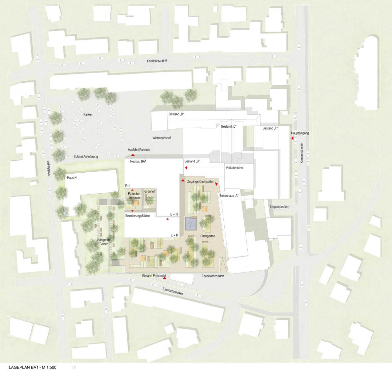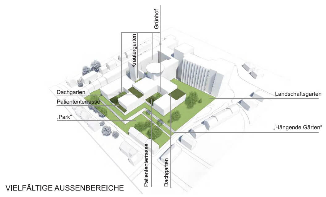 In Zusammenarbeit mit HDR Architekten. Die Gestaltung der Außenanlagen für das Krankenhaus Siegen schließt sich der konzeptionellen Vorstellung der Gebäudearchitektur an. Formell wird dies durch die Transformation der Gebäudekanten auf den Freiraum erzielt, dem alle weiteren Entwurfselemente folgen. Die Gestaltung ist auf anthroposophische Planungsprämissen ausgelegt: Mensch und Natur im Einklang, Nachhaltigkeit, Harmonie von Innen- und Außenraum. Die Entwurfsphilosophie tritt besonders bei der Ausbildung und Gestaltung der Patientengärten auf den Dachflächen hervor. Diese werden zum Bindeglied zwischen Architektur und Landschaft und dienen der unmittelbar erreichbaren Erholung und Entspannung für Patient*in, Besucher*in und Mitarbeiter*in.
