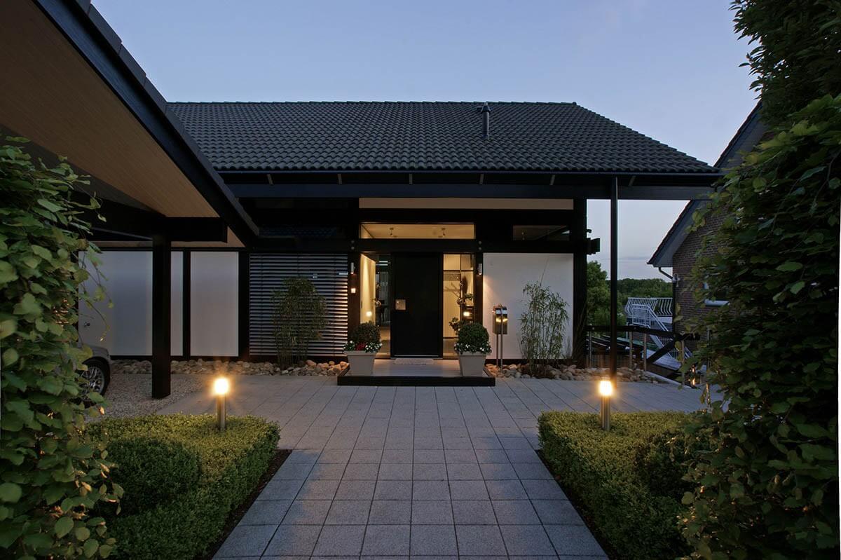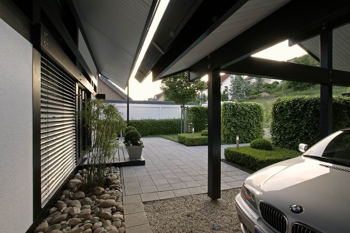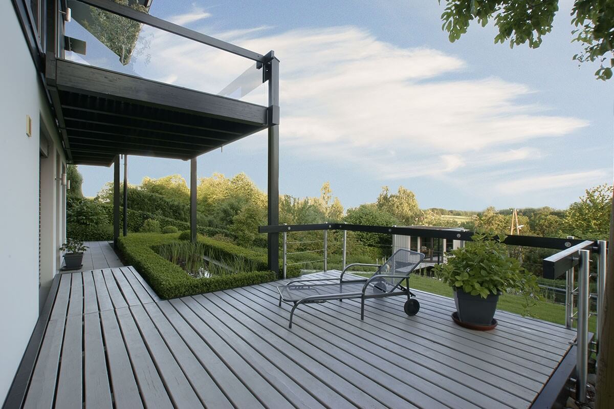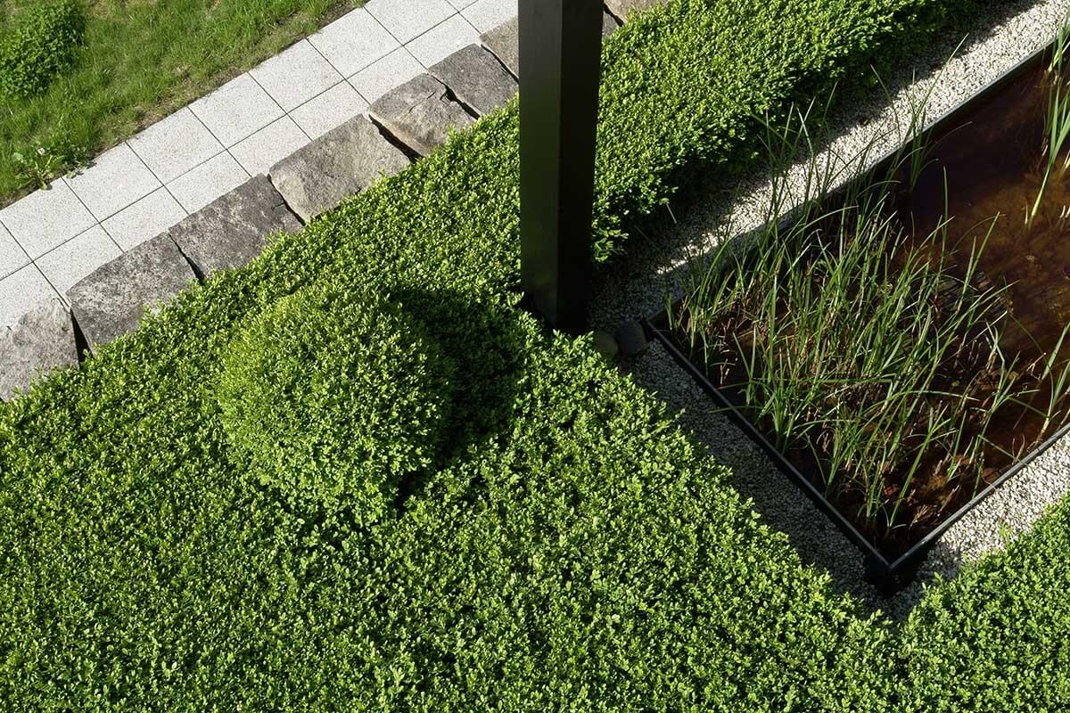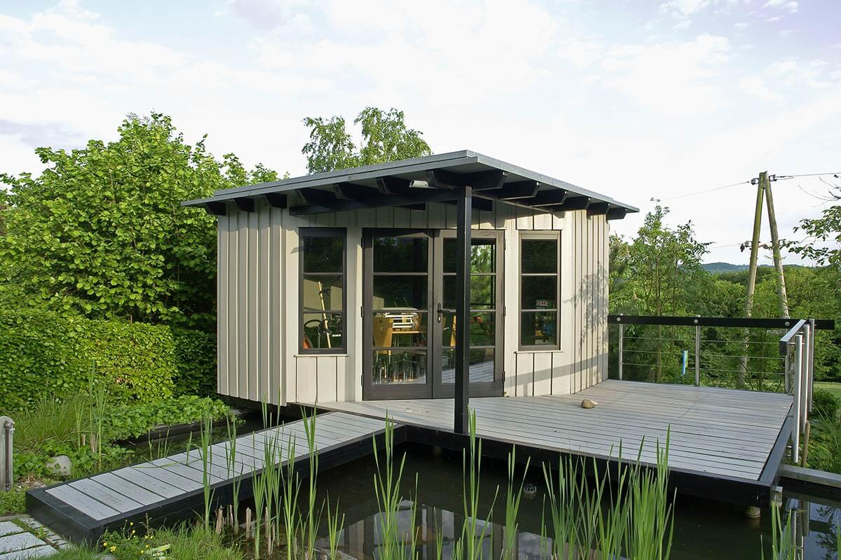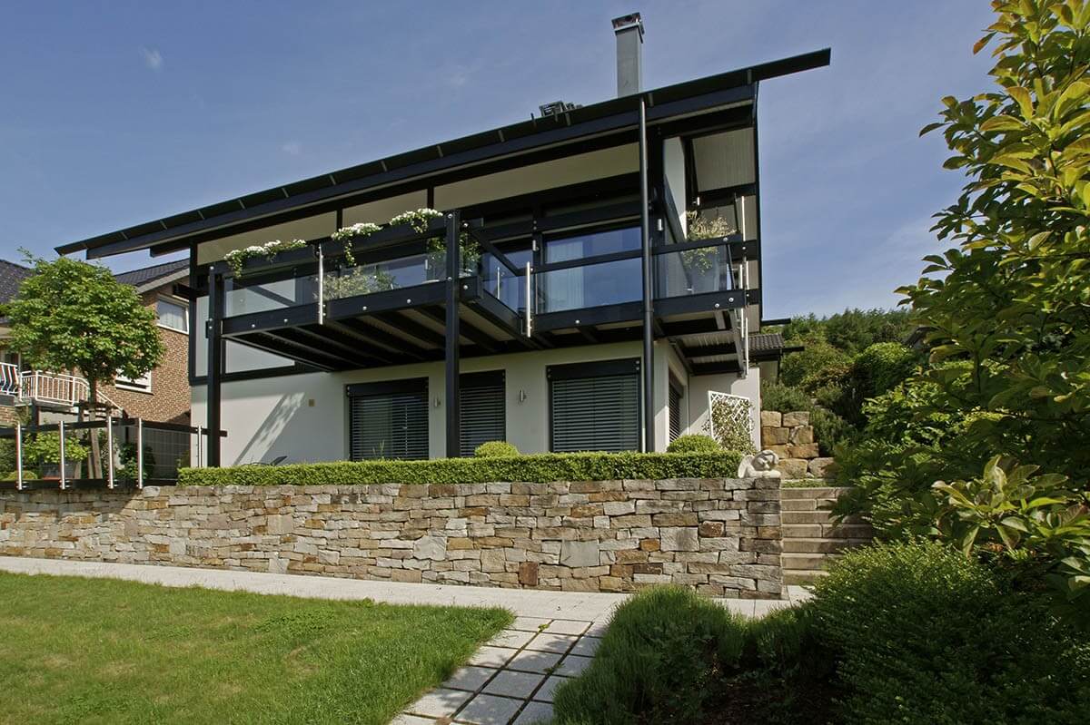 Das lang gestreckte Hanggrundstück stellte besondere Anforderungen an die Gartengestaltung, den Umgang mit den Nachbargrundstücken sowie die Erfüllung der Auflagen des Bebauungsplanes. Ziel war es, das Grundstück trotz extremer Höhensituation nutzbar zu gestalten. Dies geschieht zum einen durch den Geschossversatz des Gebäudes selbst. Zum anderen werden Terrassenbereiche am Gebäude durch Naturstein-Trockenmauern abgefangen, während seitlich Stufenanlagen den tiefer liegenden Gartenteil erschließen. Entlang einer geneigten Rasenfläche führt der Weg zum Gartenhaus und zu einer über einer Wasserfläche „schwebenden“ Holzterrasse mit Blick in die Landschaft.
